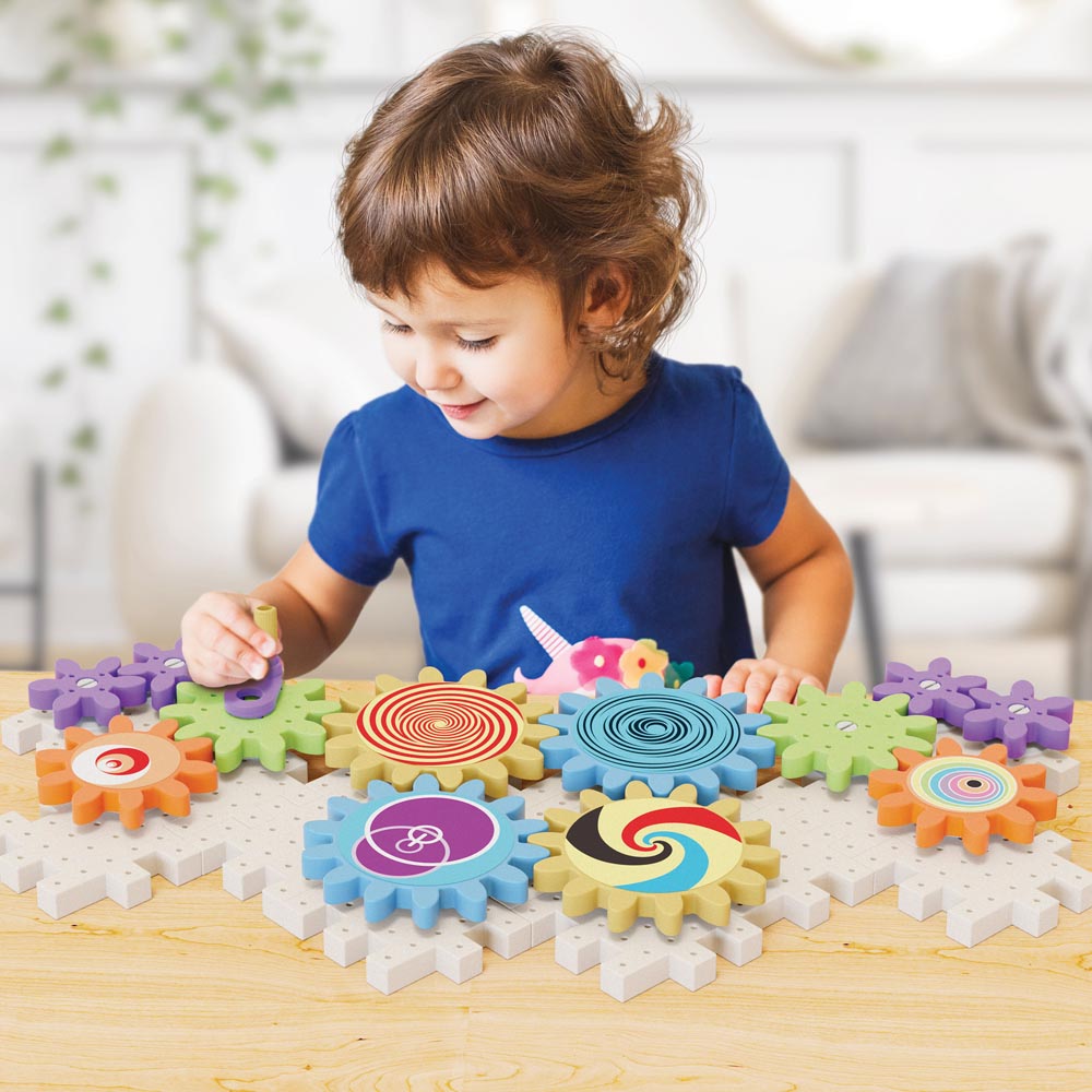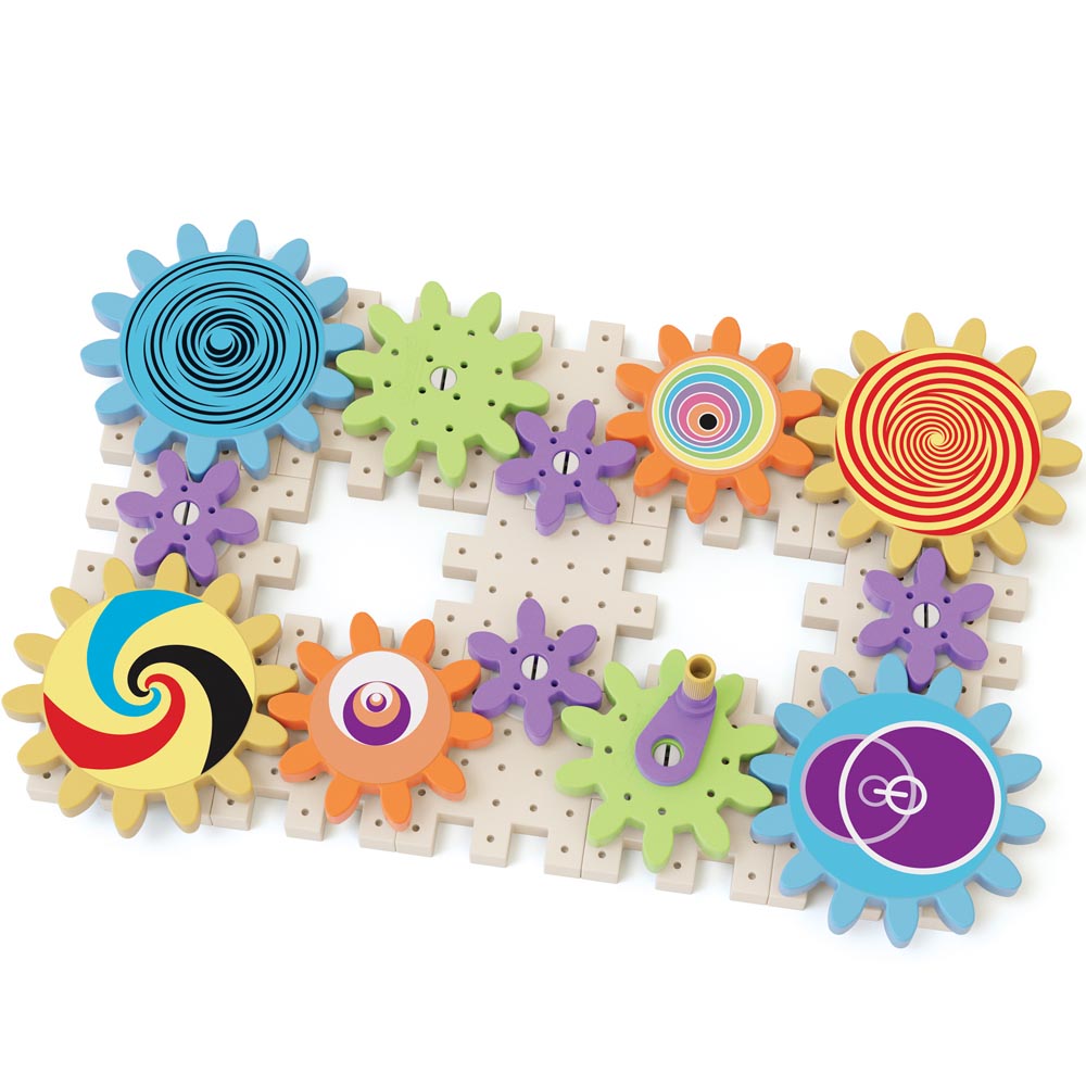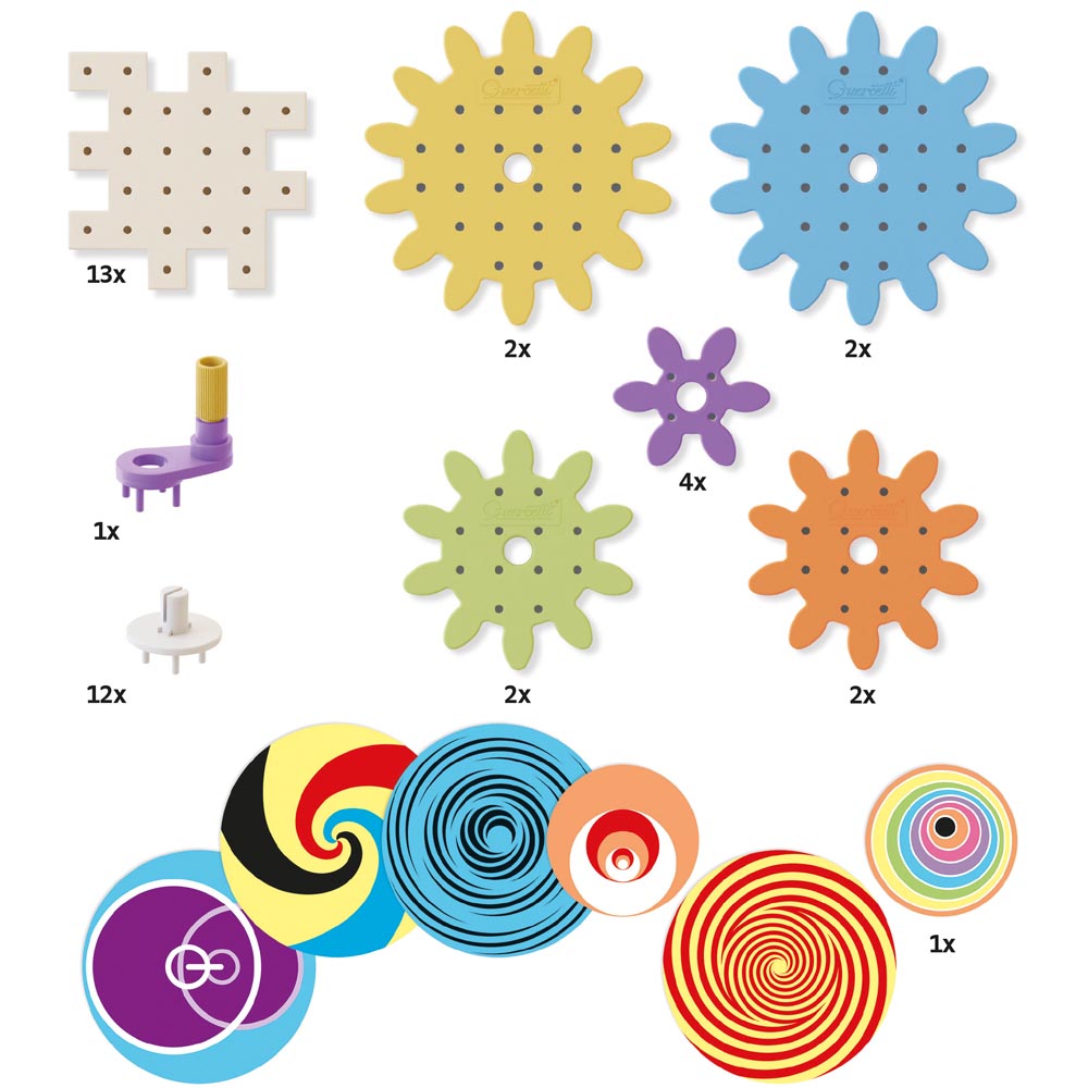 Juego de construcción con engranajes de varios tamaños para una espectacular reacción en cadena; todo empieza a moverse en cuanto giras la manivela. Aprendes, mientras te diviertes, principios mecánicos sencillos y descubres efectos ópticos extraordinarios. Incluye 4 engranajes grandes, 4 engranajes medianos, 4 engranajes pequeños, 13 placas de enclavamiento, 4 pegatinas para engranajes grandes y 2 para engranajes medianos, pasadores blancos y manivela. Fabricado en material suave y resistente.