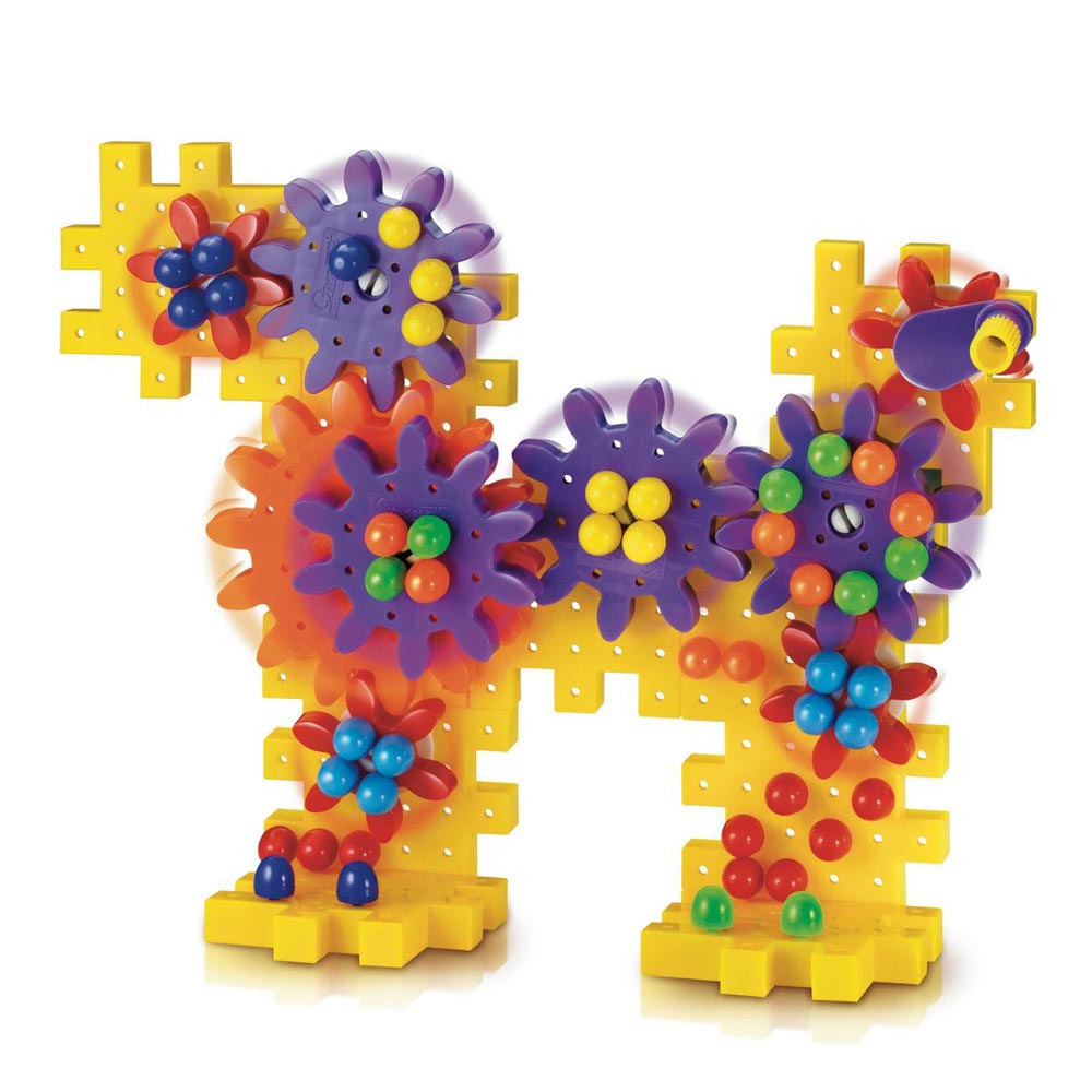 Este conjunto de engranajes y ruedas está diseñado para construir y formar circuitos de movimiento. Incluye: 1 engranaje grande (12 cm de diámetro x 1 cm), 4 engranajes medianos (9 cm de diámetro x 1 cm), 4 engranajes pequeños (6 cm de diámetro x 1 cm), 10 placas de construcción (9 x 9 x 1 cm), 48 clavijas de diferentes colores (1,2 cm de diámetro x 3 cm), 14 ruedas de enganche blancas (4 cm de diámetro) y una manija para efectuar los movimientos (5 x 5 cm). Fabricado en plástico resistente y vivos colores. Los niños pueden utilizarlos para crear circuitos de movimiento y aprender sobre los principios de la mecánica de una manera divertida y educativa.