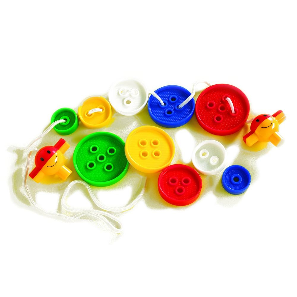 Set de 50 botones gigantes fáciles de enlazar, apilar y enhebrar. De 5 tamaños diferentes y 5 colores con 6 cordones de colores diferentes. Incluye 4 topes de lazos con caritas. Material resistente y seguro.