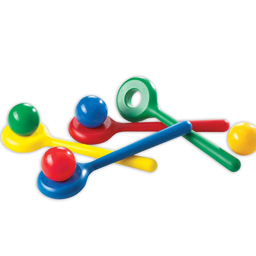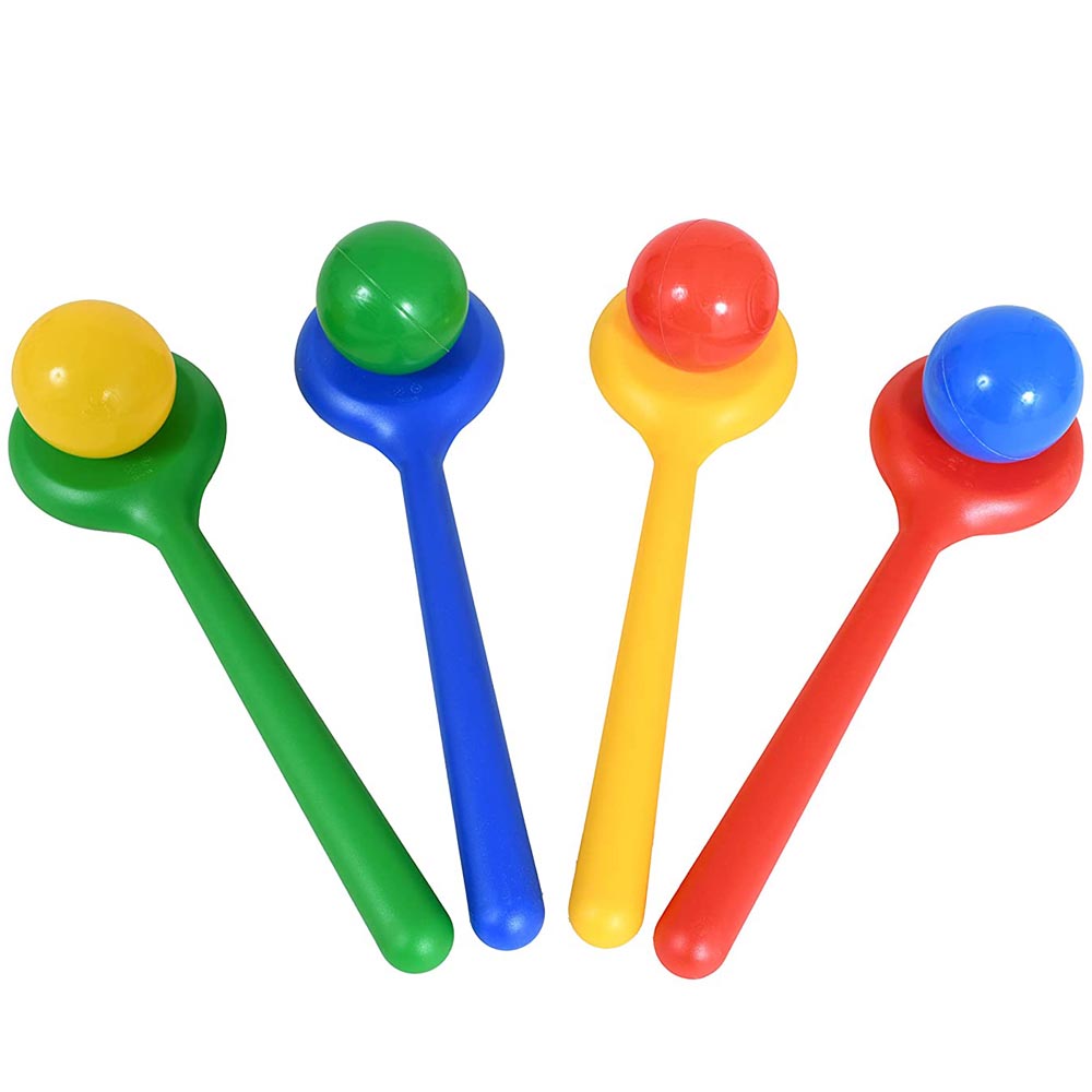 Set de 4 cucharas plásticas resistentes con 4 pelotas. De 4 diferentes colores. Para desarrollar el equilibrio y motricidad. De excelente calidad.
