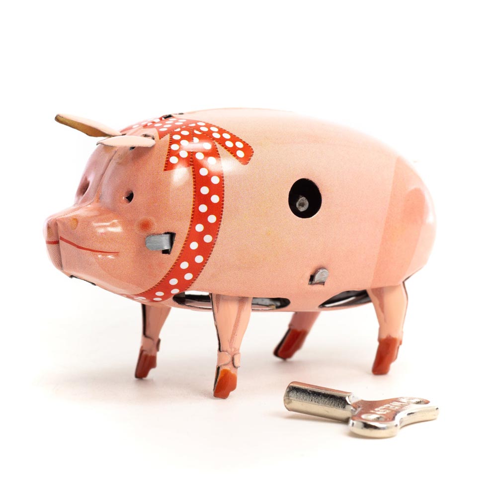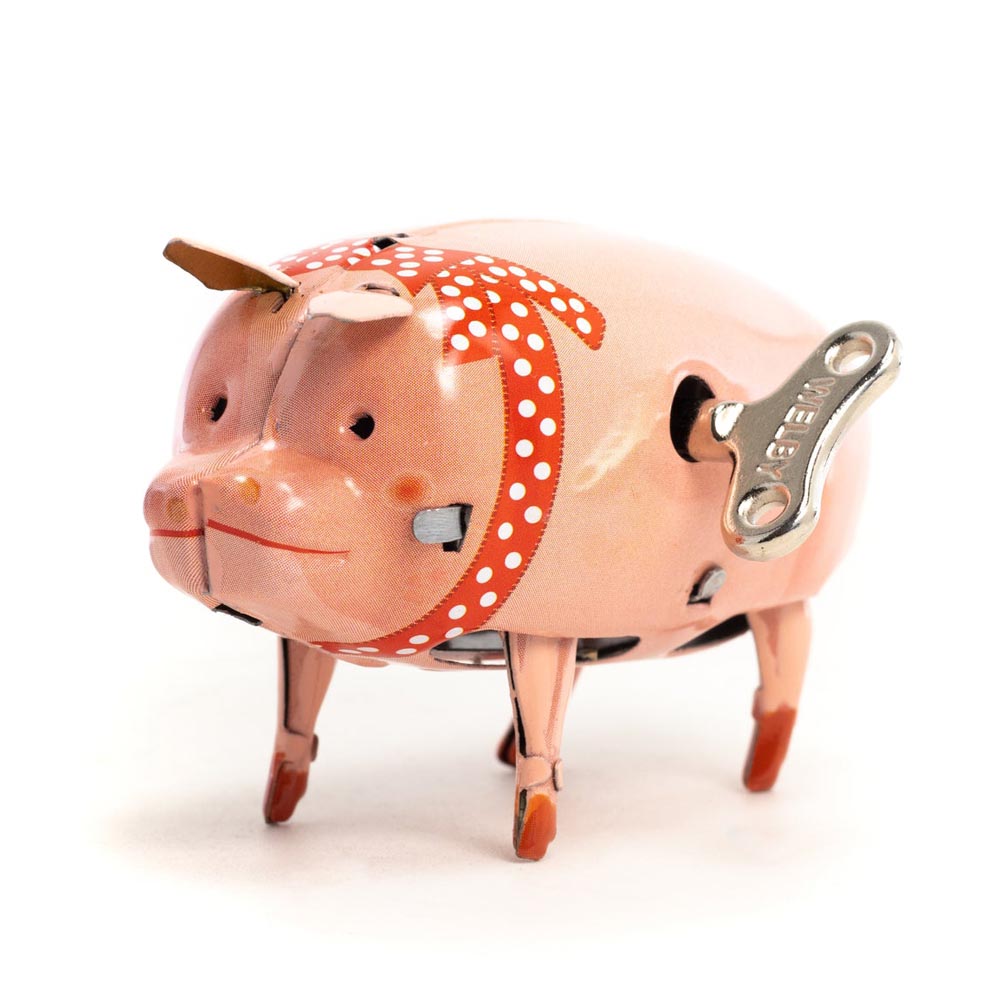 El feliz cerdo rosado a cuerda camina sobre sus cuatro patas con un movimiento realista y excitado. Articulo de colección, no utilizar como juguete.