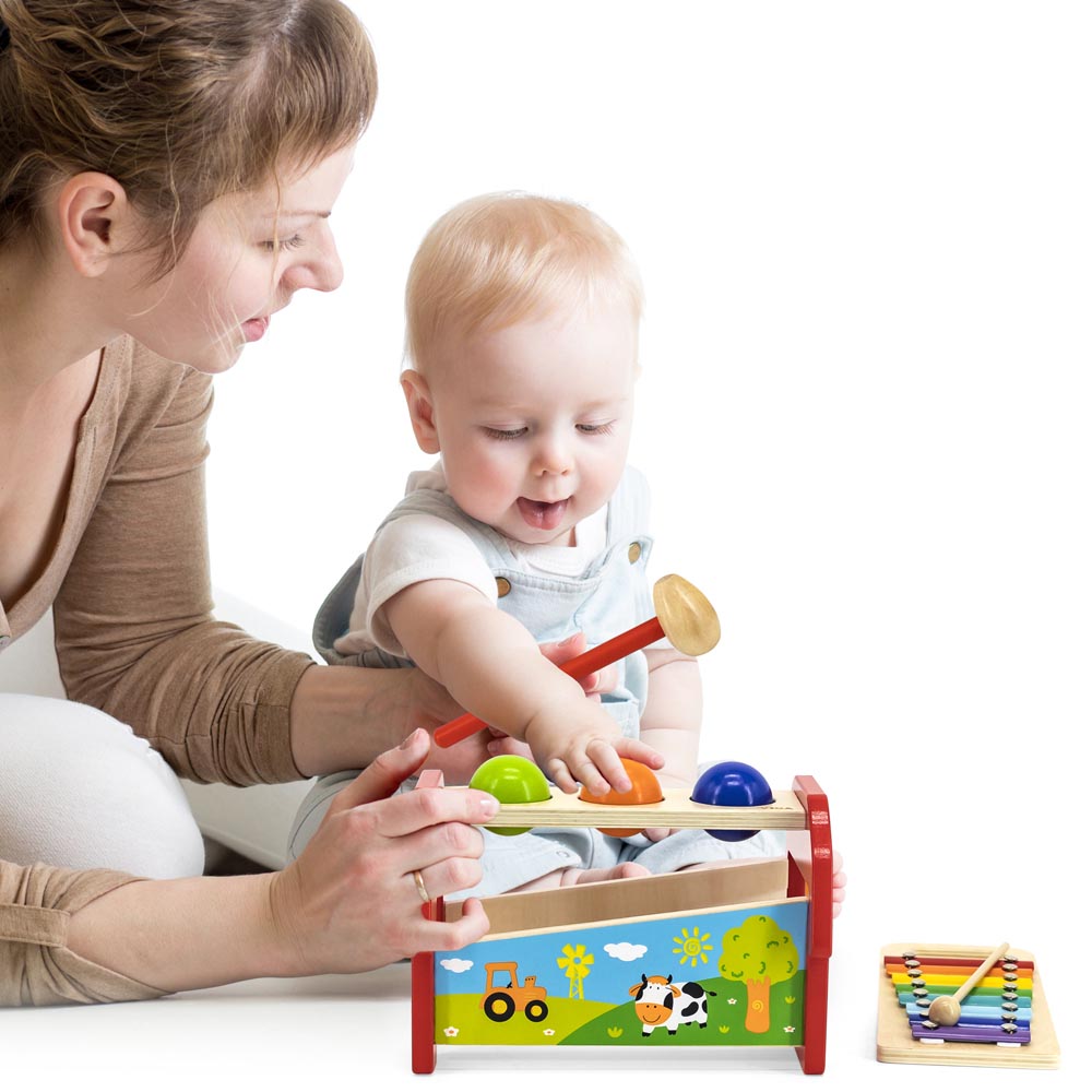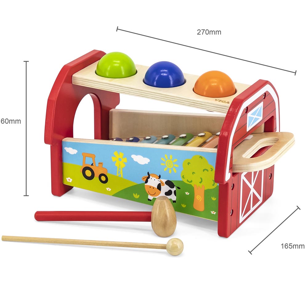 Juego de madera sonoro de 7 piezas (banco, xilófono, martillo, baqueta y 3 bolas de madera). Coloque las 3 bolas en la parte superior del banco de golpear. Usa el martillo para golpear las bolas. Una vez que una bola cae, que golpeara las teclas del xilófono que hacen diferentes sonidos. Este colorido xilófono también se puede sacar de el banco y jugar por separado.