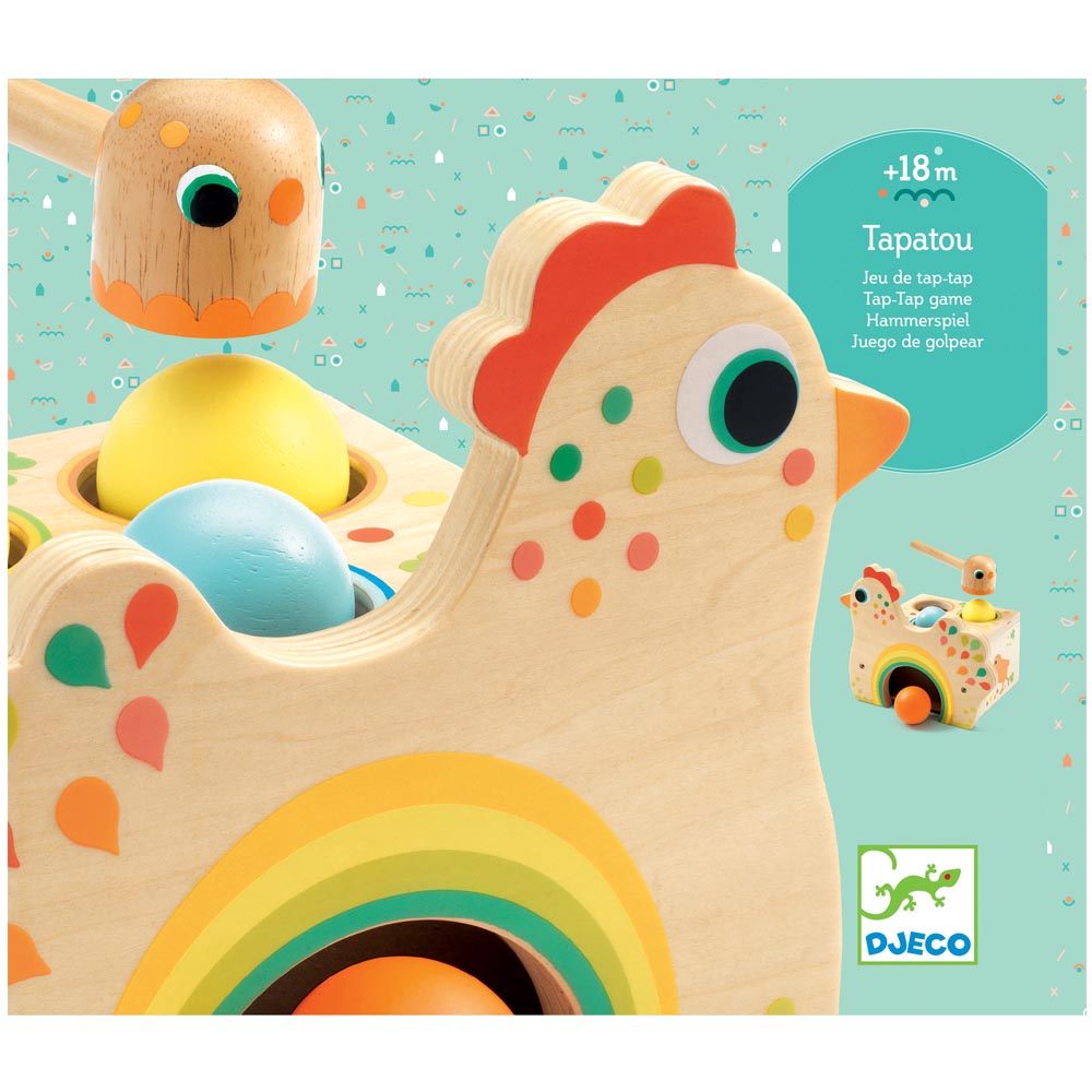 Al golpear con el divertido martillo los huevos de la gallina salen de su barriga. Entretenido juego para estimular la motricidad gruesa de los niños pequeños, con un hermoso diseño de Djeco.