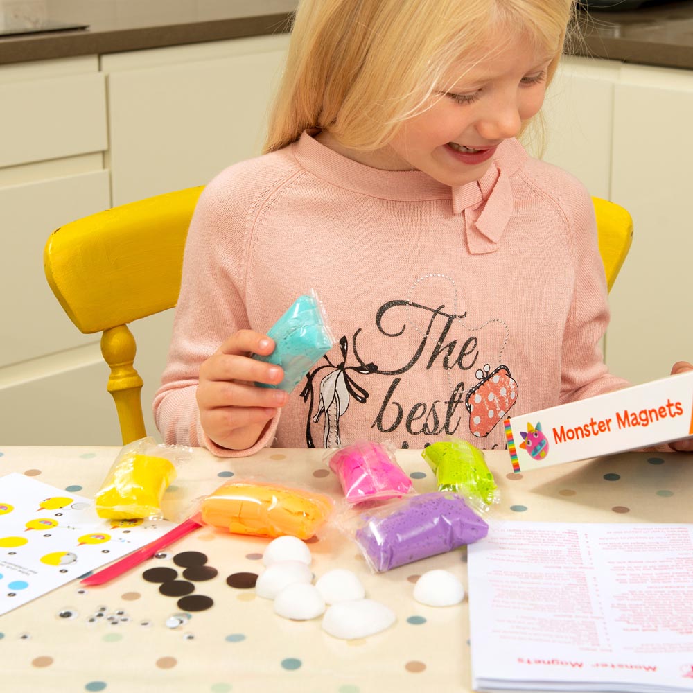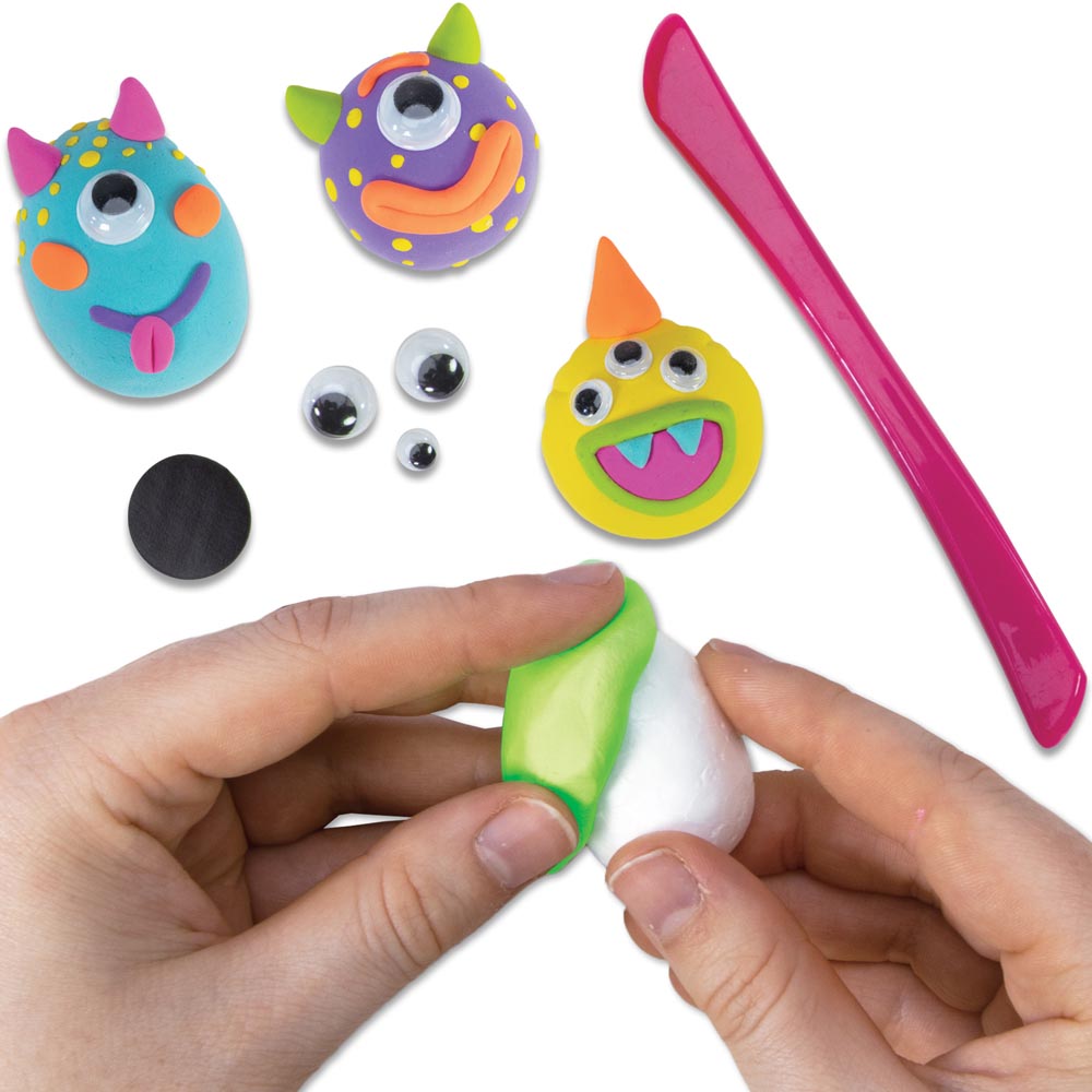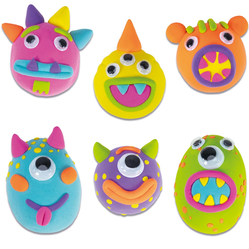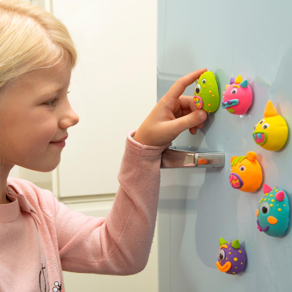 Divertido set de manualidades en el que niñas y niños podrán crear 6 poderosos imanes de monstruos con arcilla de modelado suave que se seca al aire. Un juego pensado para el desarrollo de habilidades creativas tempranas, mientras los niños y niñas modelan sus monstruos con la arcilla estarán poniendo en juego su creatividad y su motricidad fina. La arcilla es limpia, fácil de usar y no se pega en las manos.