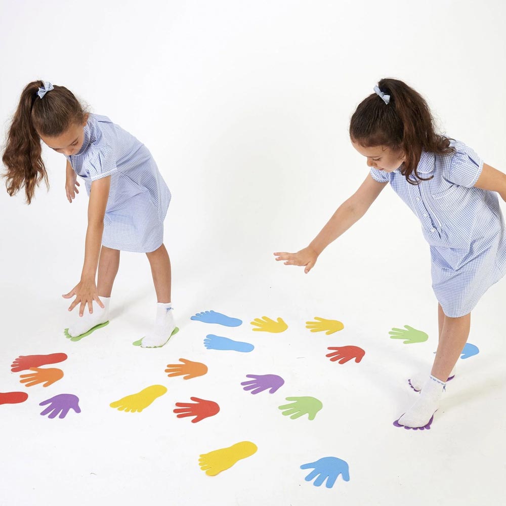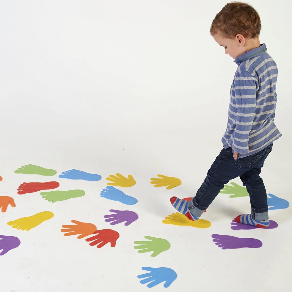 Divertido set de huellas de manos con texturas con el que se pueden crear rutas para que los niños y niñas sigan caminos, estas rutas pueden crearse a partir de un mapa para estimular el desarrollo de las nociones de espacio. Una actividad diseñada para el desarrollo de las habilidades motoras gruesas como el equilibrio y la coordinación. Fabricadas en material suave y resistente y colores vivos. Incluye 12 huellas de manos en 6 colores.