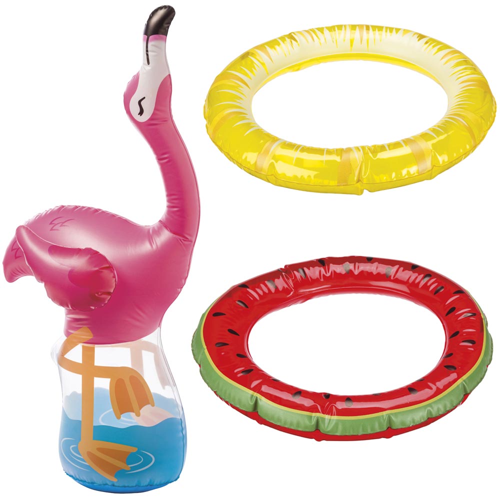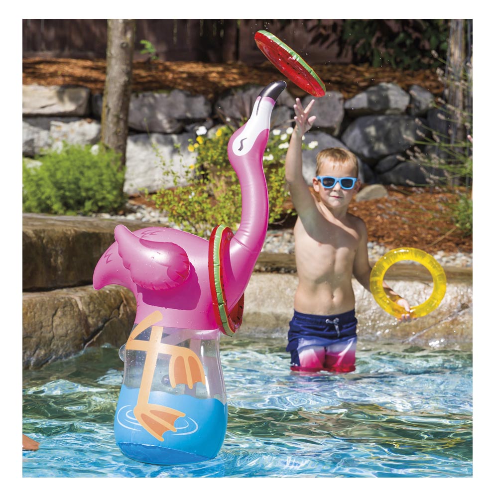 Este hermoso y divertido flamingo inflable será el juego más divertido del verano. Un inflable para jugar en el agua; en el cuello del flamingo tendrás que embocar los anillos, para pasar horas de diversión. Tiene un tamaño de 90 cm y los anillos tienen un diámetro de 20 cm. Su diseño es tierno y divertido.
