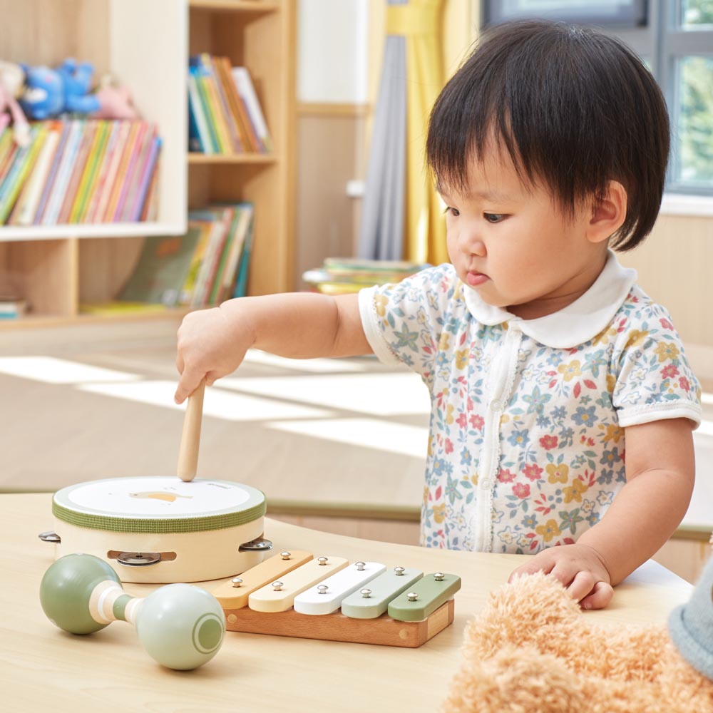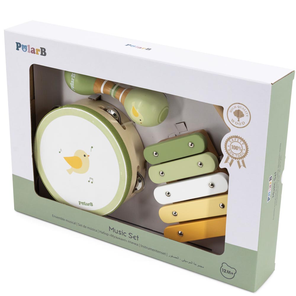 Hermoso set de instrumentos diseñado para perfeccionar las habilidades motoras y auditivas de los más pequeños mientras desarrollan su sentido innato del ritmo. Fabricados en madera lacada en exquisitos tonos pastel. Incluye una pandereta, un xilófono y una maraca doble. Este conjunto despertará la imaginación de niños y niñas y le proporcionará momentos musicales emocionantes y memorables. Ideal para estimular las habilidades musicales, el sentido de la escucha, la creatividad, la destreza y mucho más. Pandereta 15,3 x 15,3 x 4,5 cm, xilófono 13 x 13 x 3,1 cm, palo 12 x 1,5 x 1,5 cm, maracas 14,5 x 4,8 x 4,8 cm.