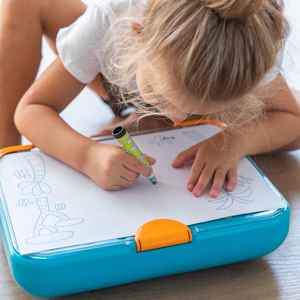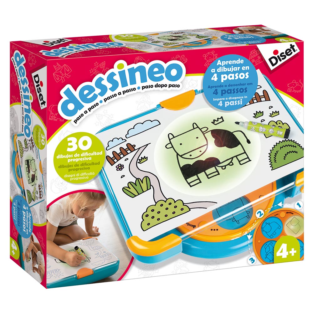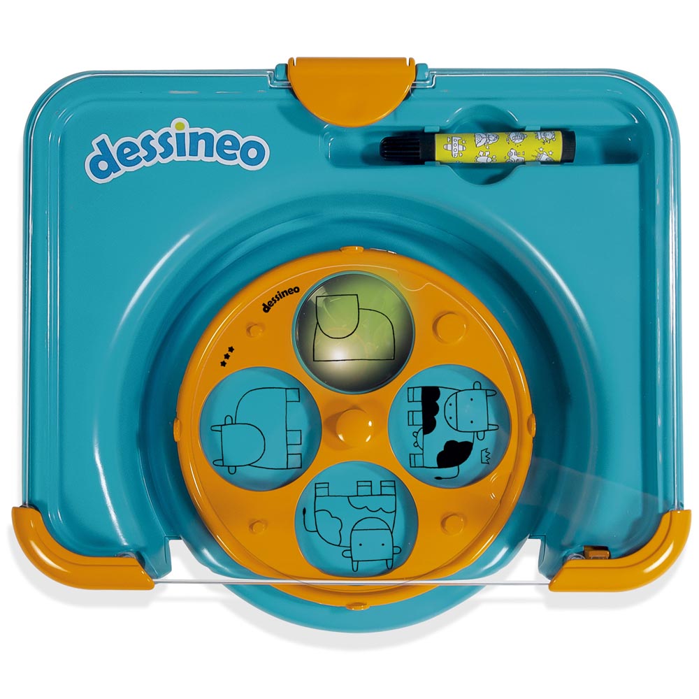 Maletín educativo que cuenta con un sistema giratorio en el que se ponen diferentes discos que se proyectan mediante luz. Incluye 30 discos de dificultad progresiva para aprender a dibujar en 4 pasos y un plumón que se guarda en un compartimento interior. Funciona con pilas 4 x AA (no incluidas) estimula la creatividad y la imaginación.