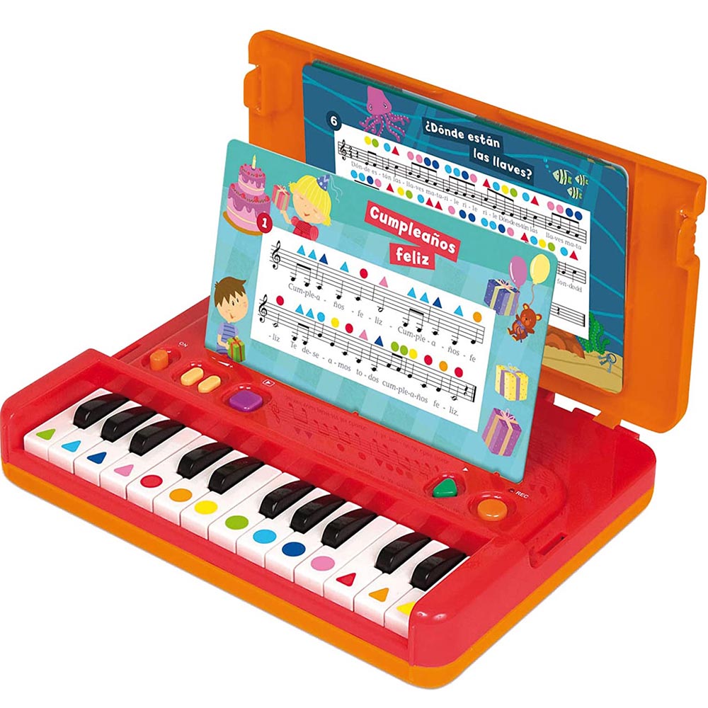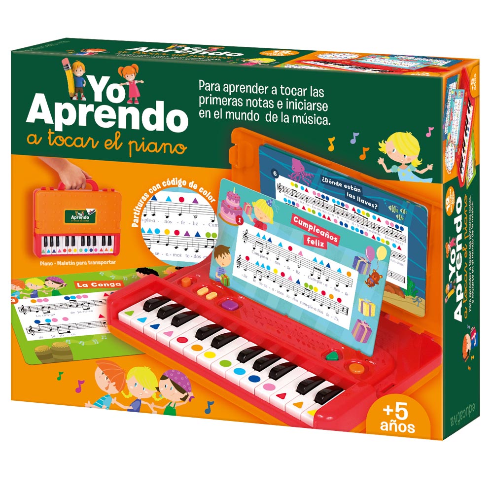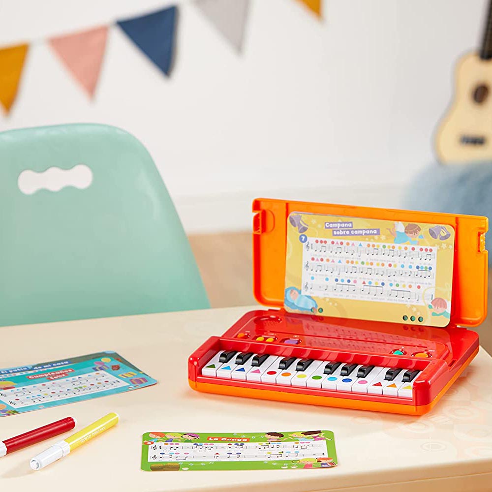 Este juguete educativo es una excelente manera para que los niños aprendan a tocar sus primeras notas y se inicien en el mundo de la música. El juego incluye 12 partituras que guían al niño a tocar canciones siguiendo los colores de las notas, lo que hace que el proceso de aprendizaje sea más divertido y accesible. Además, el piano en forma de maletín facilita el almacenamiento y transporte del juego. También cuenta con un sistema auto correctivo que permite a los niños verificar si están tocando de manera correcta, lo que fomenta el aprendizaje autónomo y la práctica musical.