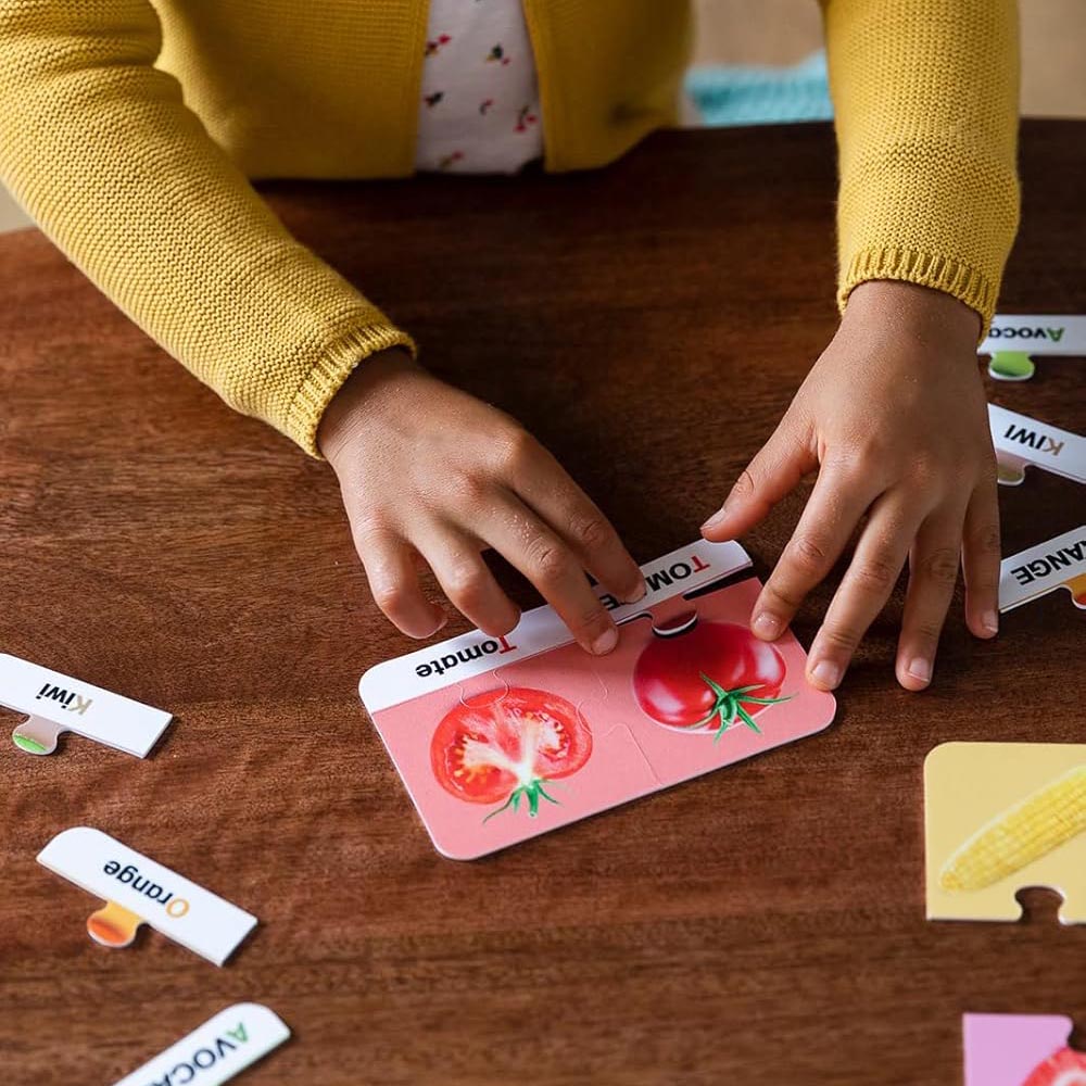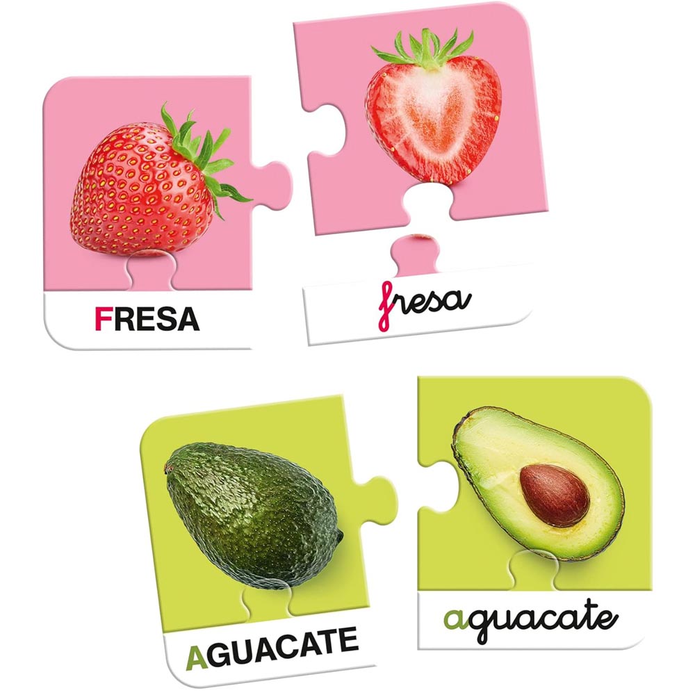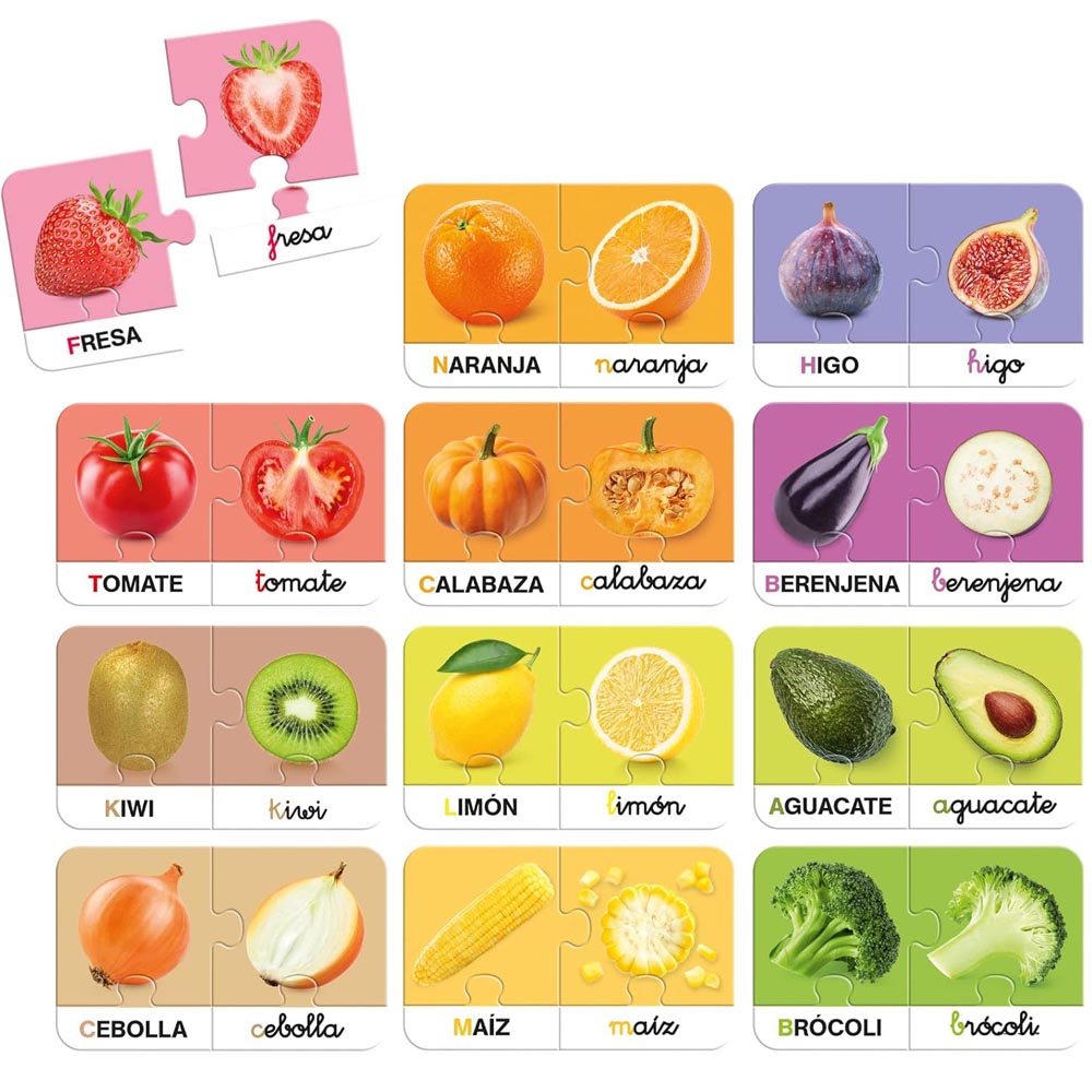 Divertido juego de puzles educativos de frutas y verduras. Con este juego los niños y niñas desarrollan el lenguaje, la lectura y mucho más. De material suave y resistente y colores vivos. Incluye 12 puzles de 4 piezas con 24 imágenes de frutas y verduras.