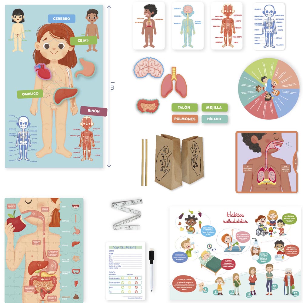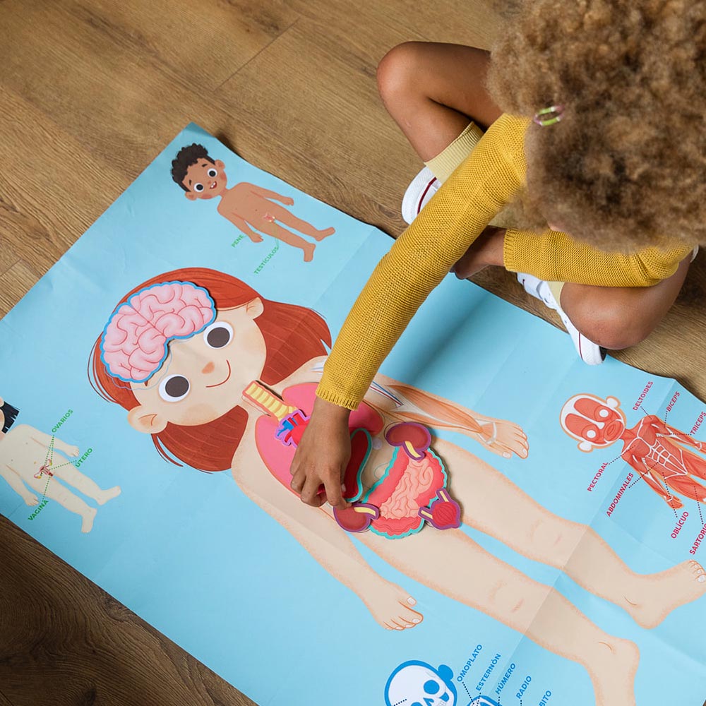 Un divertido juego educativo diseñado para acompañar el aprendizaje de niños y niñas de 4 a 7 años de edad sobre el cuerpo humano. Incluye materiales que los estudiantes pueden manipular para aprender, más de 50 actividades de aprendizaje, manual educativo y poster con hábitos para una vida sana. Con este juego los niños y niñas podrán descubrir los sistemas vitales y la conexión entre los órganos. Contenido: posters, cinta métrica, piezas con velcro de los órganos más importantes, 15 cartas informativas sobre el cuerpo humano y mucho más.