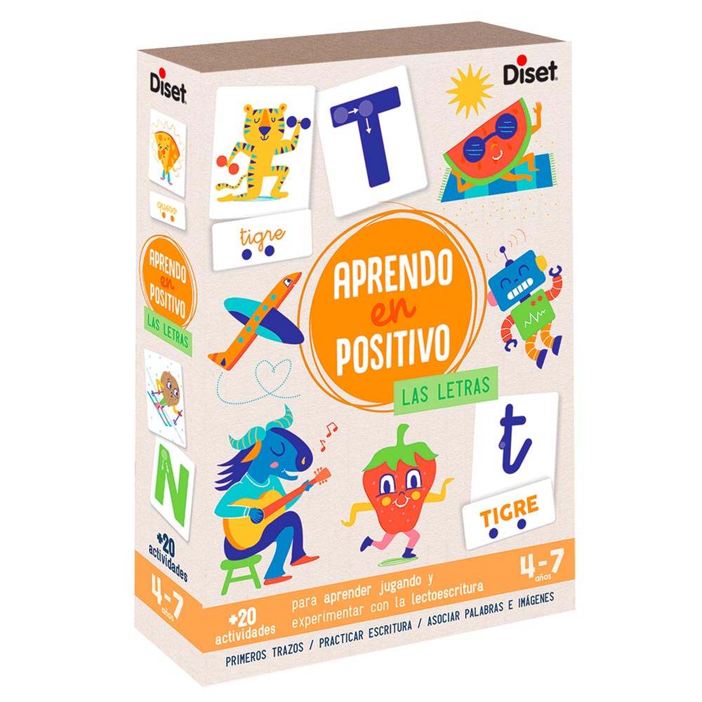 El juego aprendo en positivo las letras ofrece a los niños y niñas de entre 4 y 7 años material manipulativo que les ayuda a descubrir y experimentar la lectoescritura a su propio ritmo. El material de la caja permite: familiarizarse con los sonidos del lenguaje, identificar y reconocer el alfabeto, relacionar imágenes y palabras, practicar la caligrafía, escribir, leer y deletrear las primeras palabras. 77 tarjetas doble cara con letras mayúsculas y minúsculas, y la dirección de escritura marcada, 27 tarjetas de ilustraciones diversas, 27 tarjetas de palabras con puntos de colores que señalan el número de sílabas, ruleta con las letras del abecedario, pizarra borrable con cuadrícula de escritura, juego del gato y el ratón y crucigrama, rotulador borrable para la pizarra, póster con juego de busca y encuentra y guía visual del contenido.