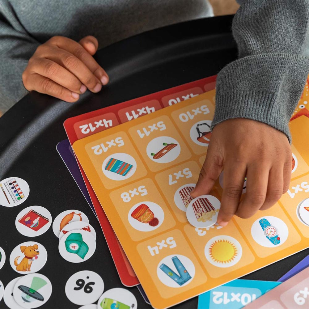 Juego educativo con que los niños se familiarizaran con las tablas de multiplicar. Cada lamina representa una tabla de multiplicar diferente así los niños podrán repasar y aprender las tablas de multiplicar del 1 al 12. Con sistema auto correctivo en que cada una de las multiplicaciones se asocia a un dibujo. Incluye 6 laminas doble cara con las 12 tablas de multiplicar y 59 fichas reversibles.