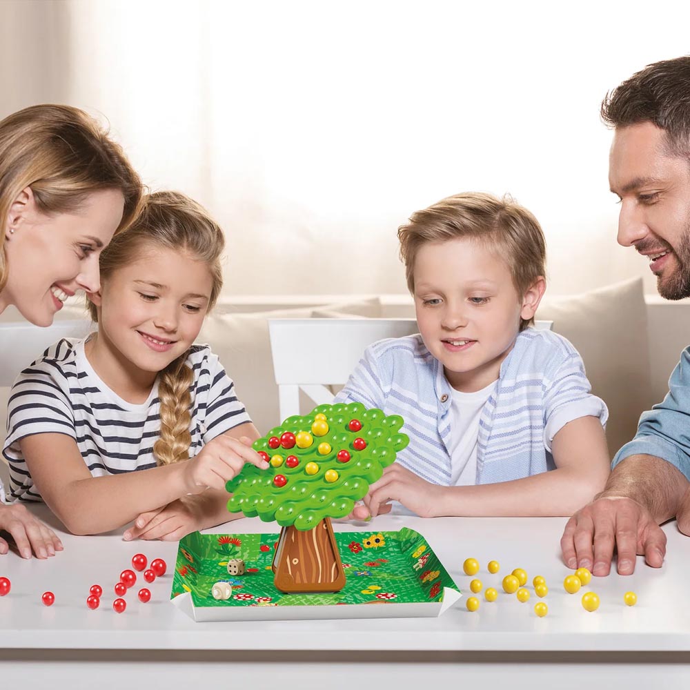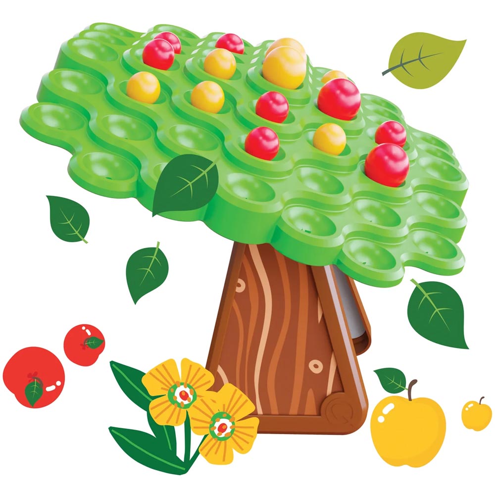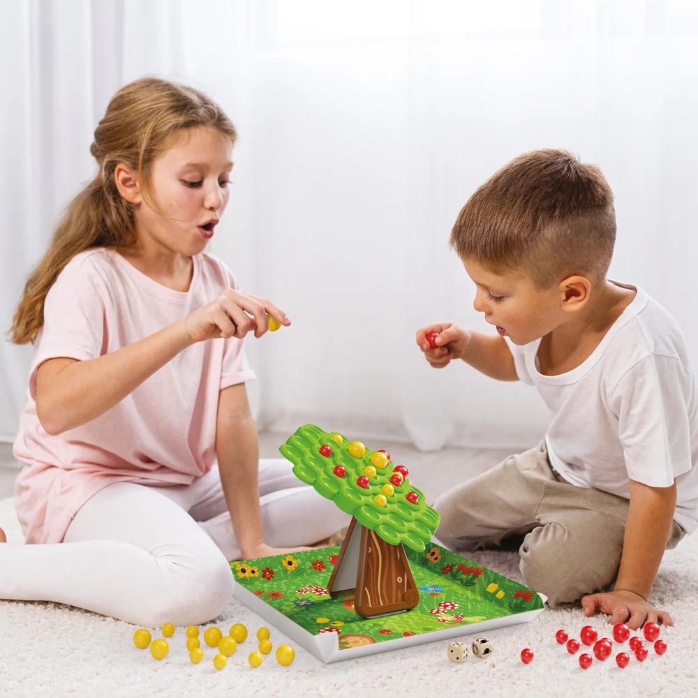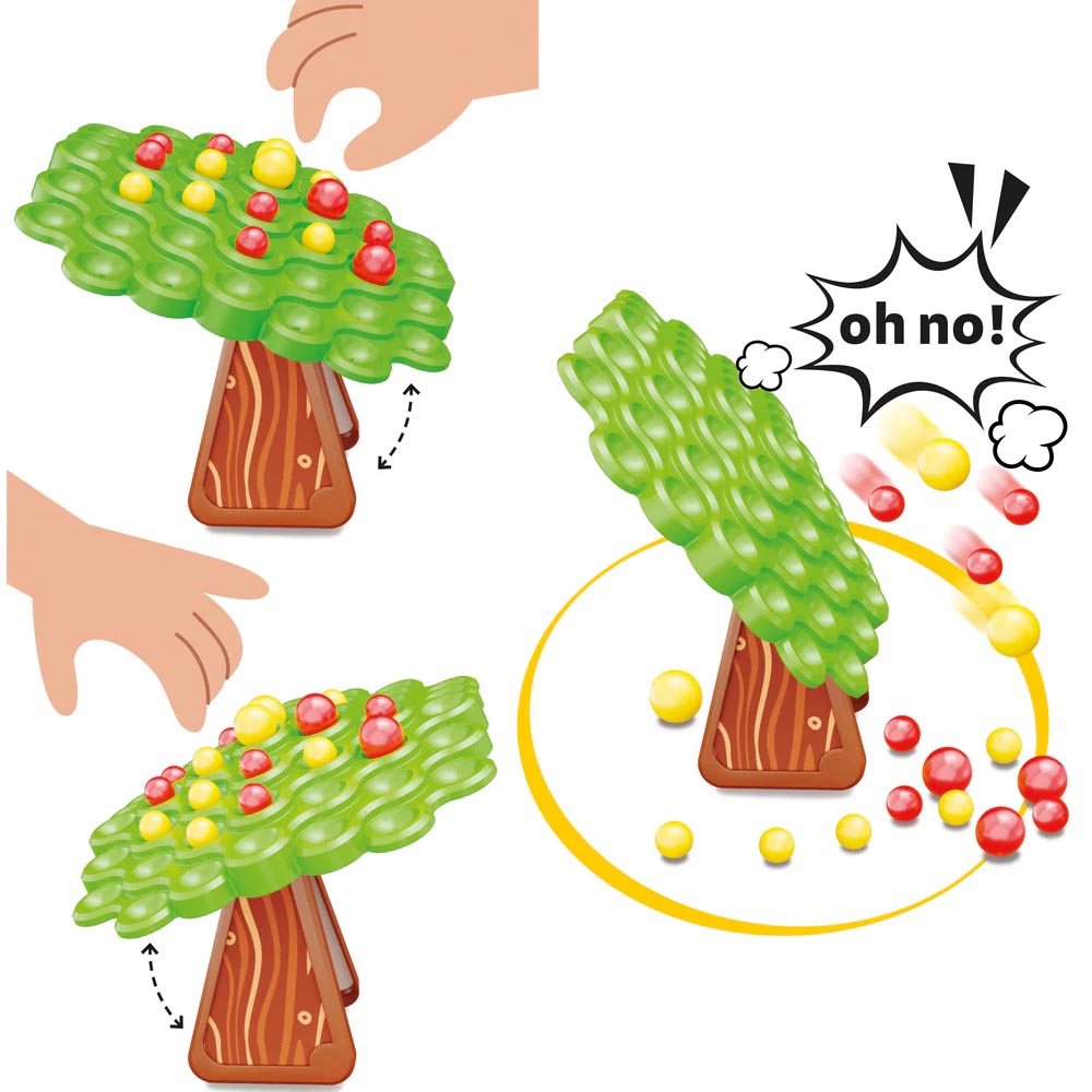 Un divertido juego que pone a prueba el sentido del equilibrio y las leyes de la gravedad. Cada jugador, por turnos, debe colocar las manzanas rojas y amarillas en la copa del árbol oscilante, intentando que no se derrumbe. ¿Podrán mantener el control y evitar el desastre? 1 «copa de árbol» verde, 1 «tronco» para sostener la copa, 1 bolsa con 24 «manzanas» amarillas, 1 bolsa con 24 «manzanas» rojas,2 dados, 1 bandeja de cartón, 1 pieza troquelada con el diseño del tronco, instrucciones. Estimula el pensamiento lógico, la paciencia, el pensamiento estratégico, la motricidad fina y mucho más. Fabricado en material suave y resistente.