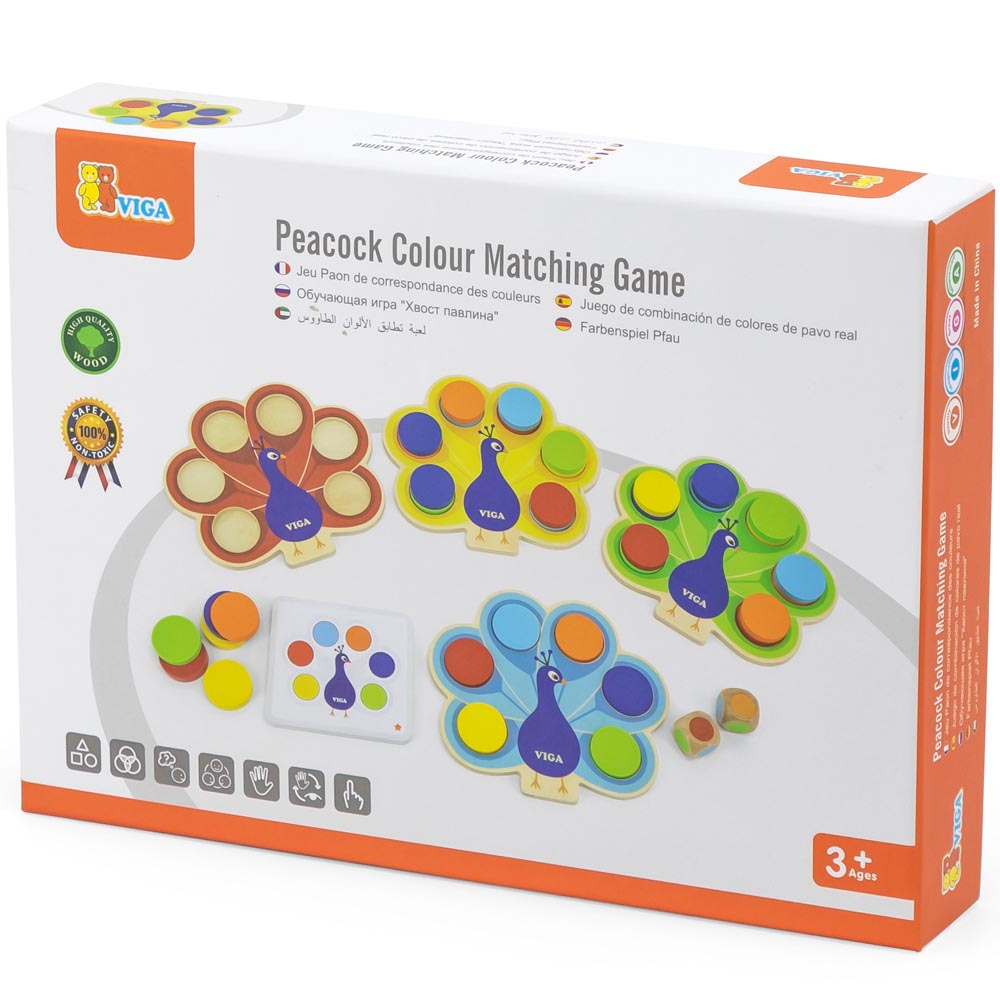 Este divertido juego de combinación de colores incluye 4 tableros de pavo real, 2 dados, 36 fichas de colores y 20 tarjetas de juego de doble cara. Al colocar las fichas de color correspondientes en el tablero del pavo real según la tarjeta de juego se pone a prueba la capacidad de los niños y niñas para leer imágenes e identificar colores. Cuando se juega entre amigos, cada uno elige una carta y coloca la ficha de color sobre el pavo real según los dados. El jugador que primero complete el patrón gana. Ideal para estimular el reconocimiento de colores, la coordinación mano-ojo y las respuestas rápidas. Fabricado en madera de alta calidad.