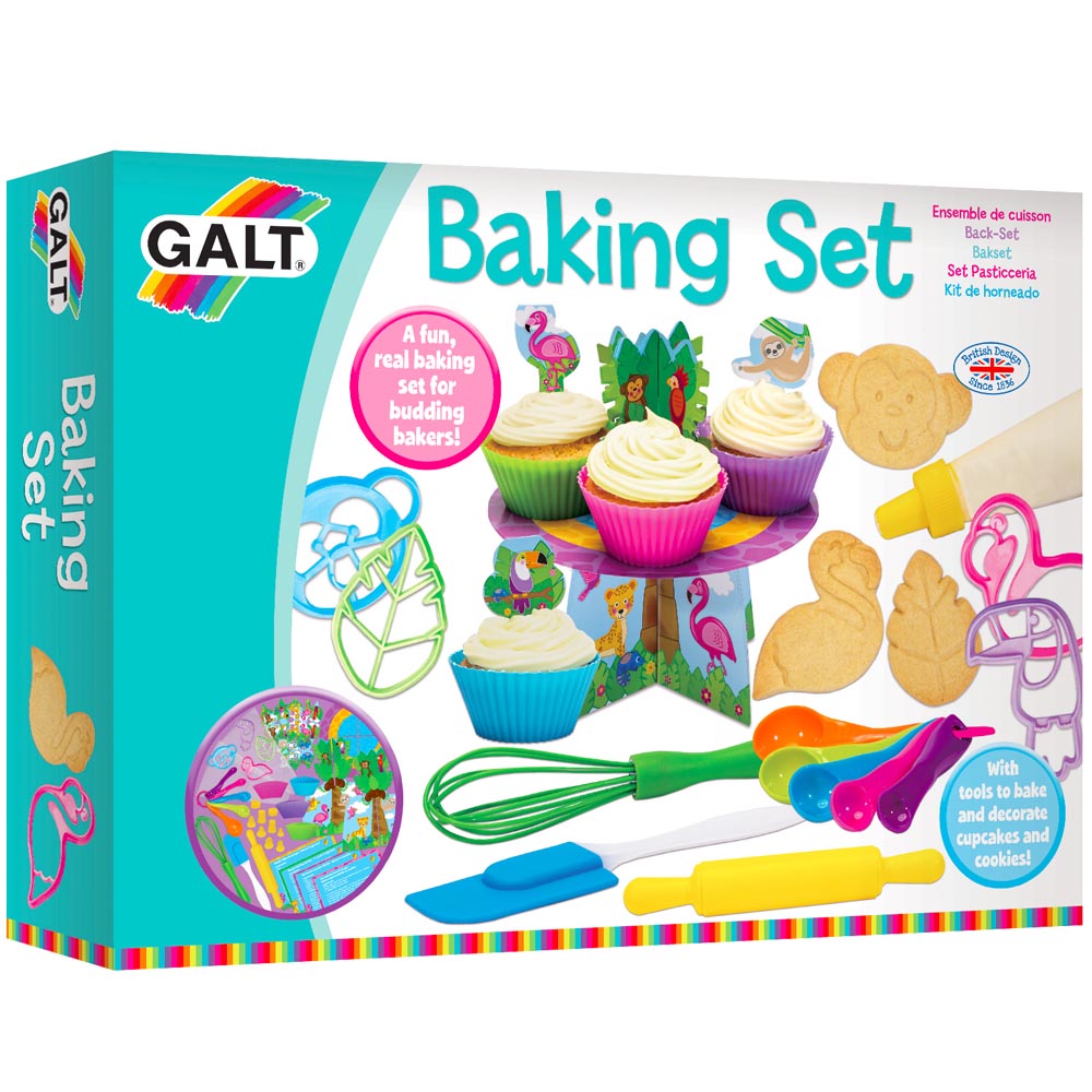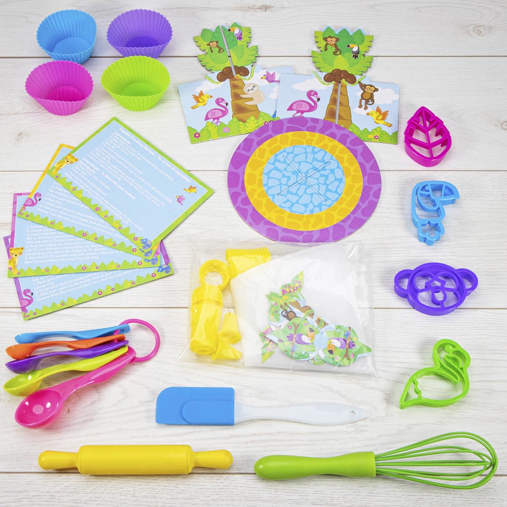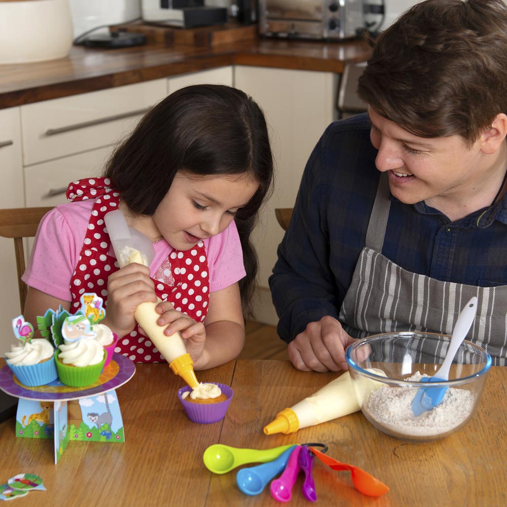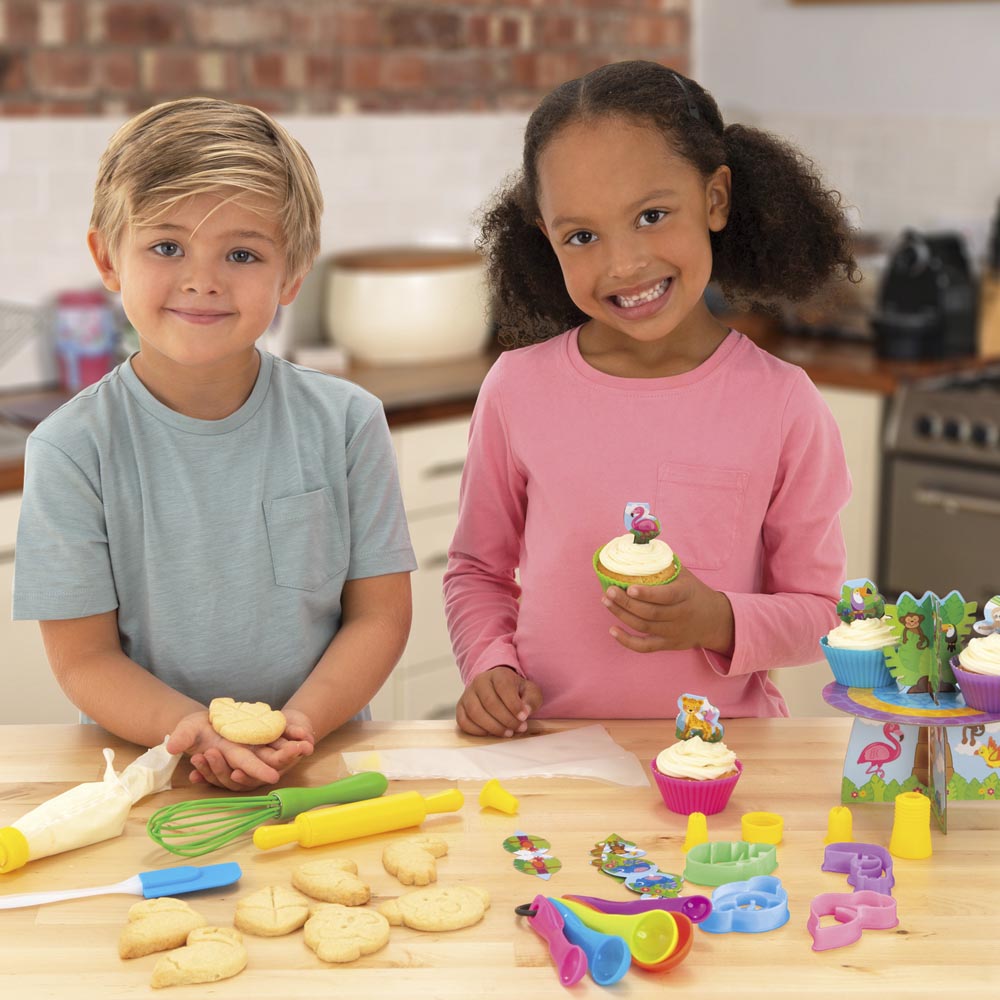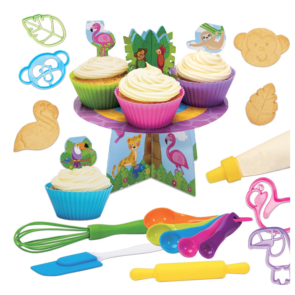 Divertido juego para hornear con utensilios brillantes y coloridos. Utiliza las herramientas y el equipo para hornear magdalenas y galletas reales para decorar con el juego de glaseado. Incluye rodillo, espátula, batidor, 5 cucharas medidoras, 4 cortadores de galletas, 4 fundas de silicona reutilizables, soporte para tartas, 8 toppers para tartas, 4 tarjetas de recetas y guía.