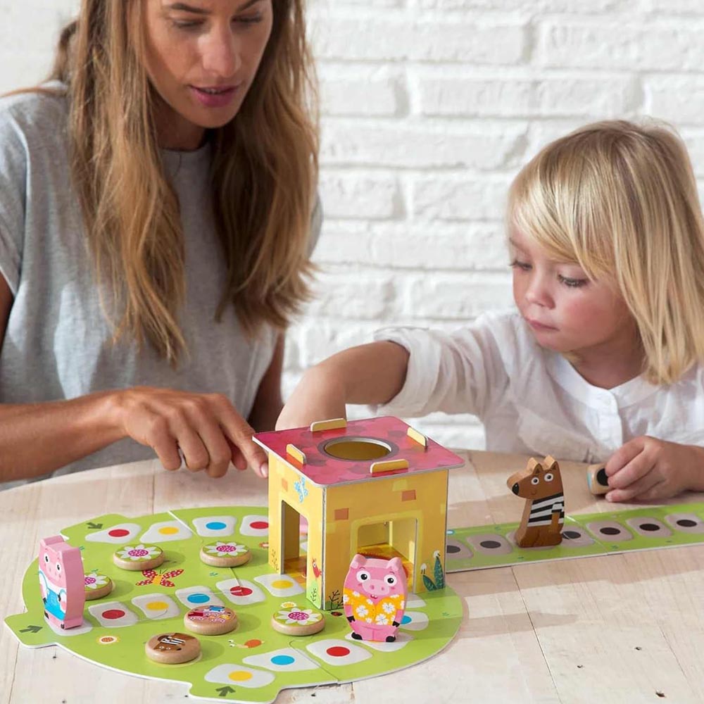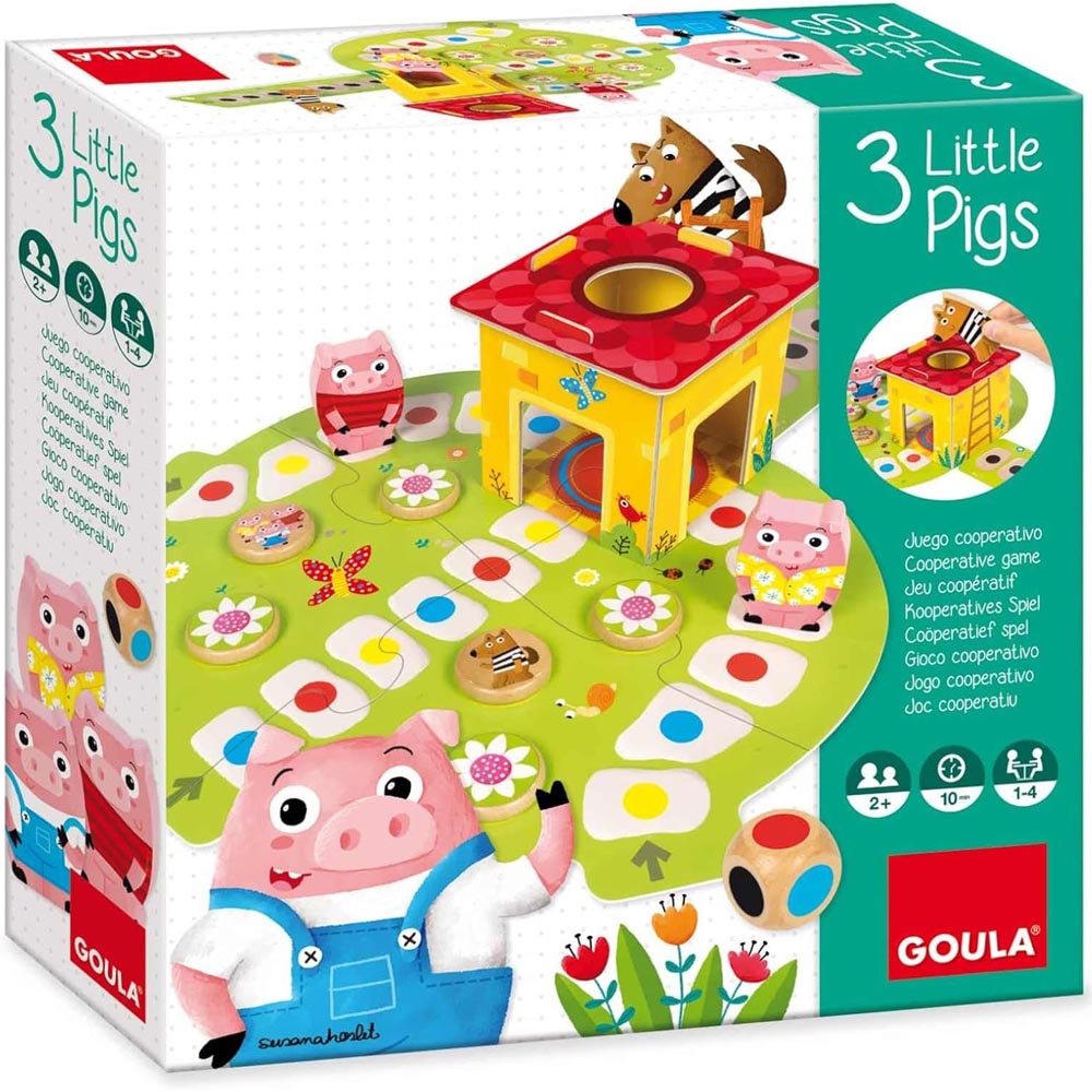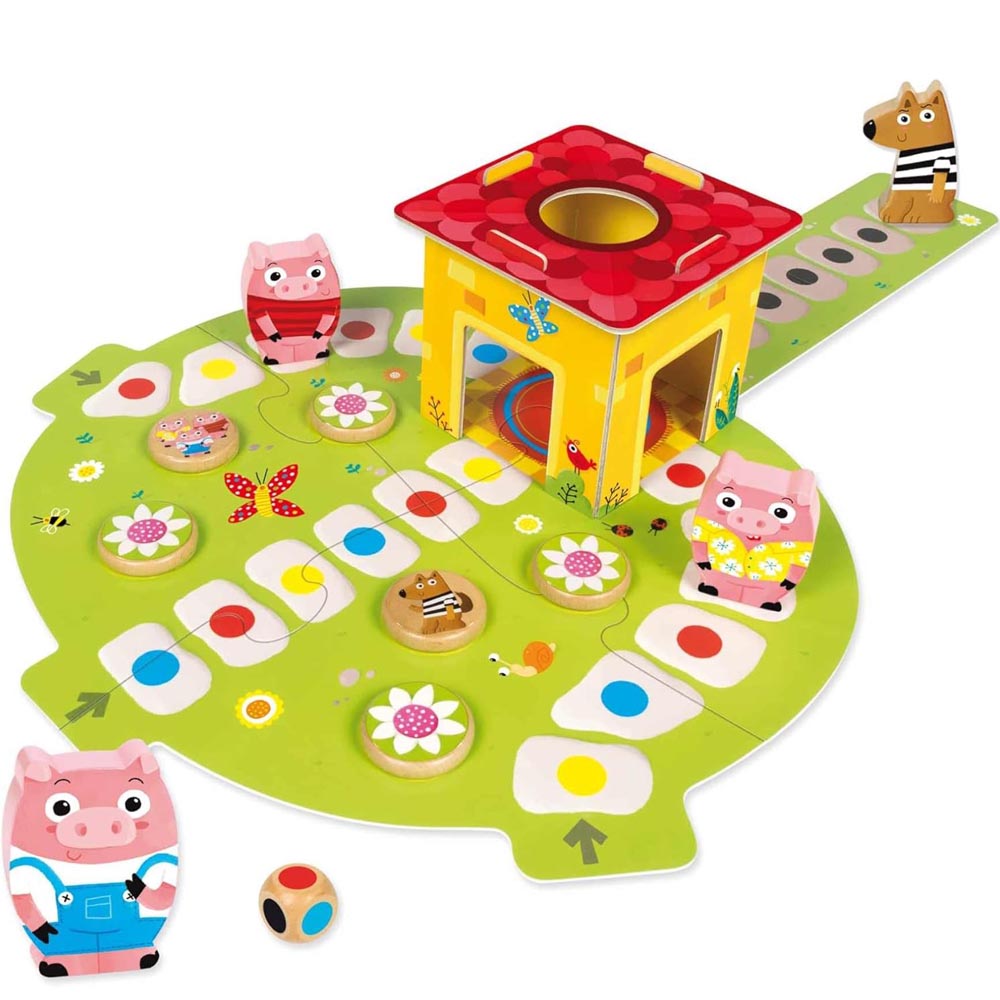 El primer juego cooperativo para los mas pequeños. Los 3 cerditos han de llegar a casa antes que el lobo. Sencillas reglas de juego. 11 grandes piezas de madera, tablero Puzle y casita 3d. Juego cooperativo y competitivo.