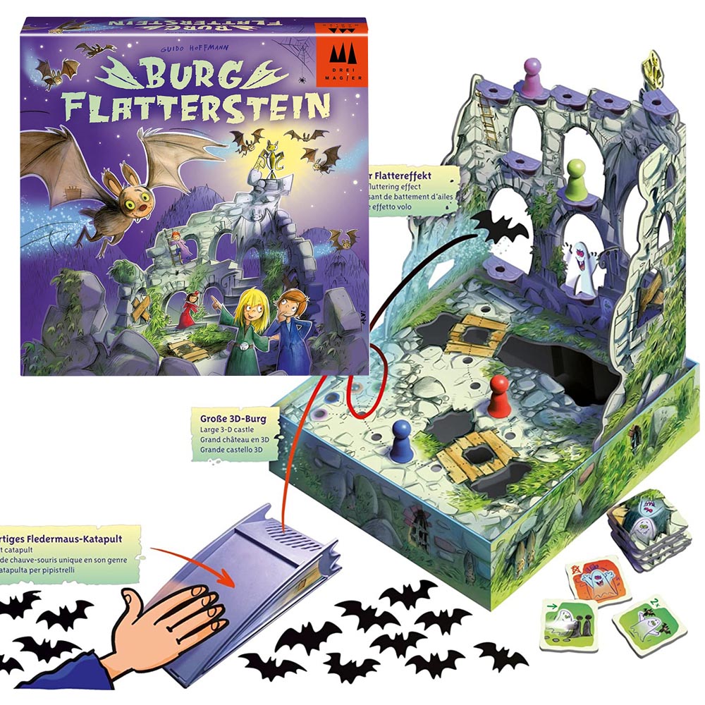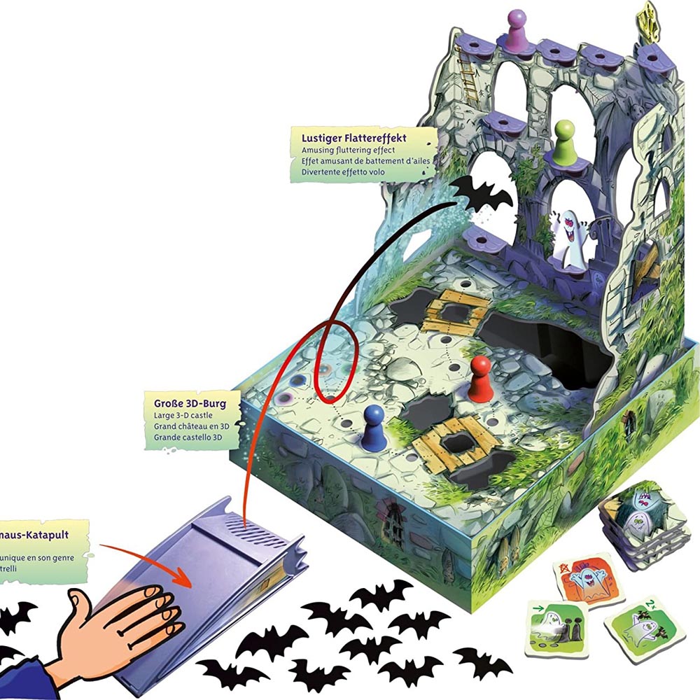 Una emocionante carrera por la copa mágica. La misteriosa ruina está llena de obstáculos y sorpresas ingeniosas. Pero con un poco de suerte y habilidad, los pequeños murciélagos revolotean hacia los lugares correctos y muestran a los niños el camino más rápido hacia su destino. Para jugar entre 2 a 4 jugadores.