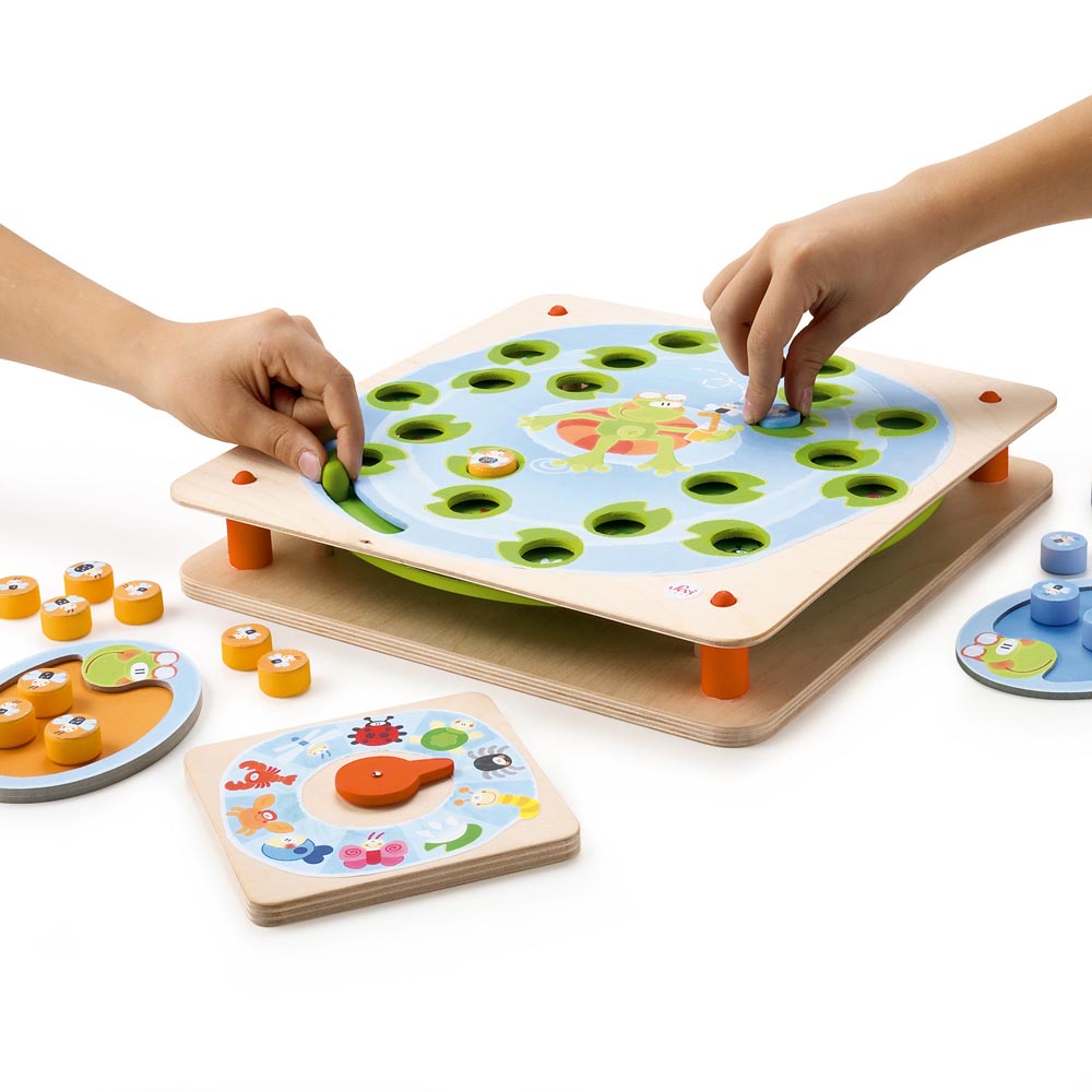 ¿Cuántas moscas hay en la charca? Ayuda a tu rana para que logre comérselas, pero atento a los peces. Haz girar la rueda y confía en tu memoria, pon la mosca en el animal y gira el disco. ¿Quién conseguirá comer más? Juego de memoria, estrategia y suerte.