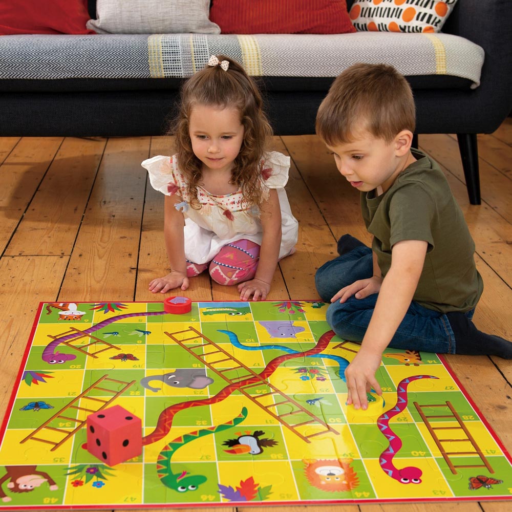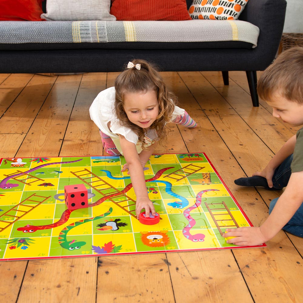 Gigante juego de mesa y Puzle de 36 piezas para 2 a 4 jugadores. Arma el Puzle y luego juega el juego con los dados de espuma grande y las 4 fichas grandes. Anima a los niños a contar mientras se divierten. Medida Puzle armado 80 x 80 cm con instrucciones de juego incluidas.