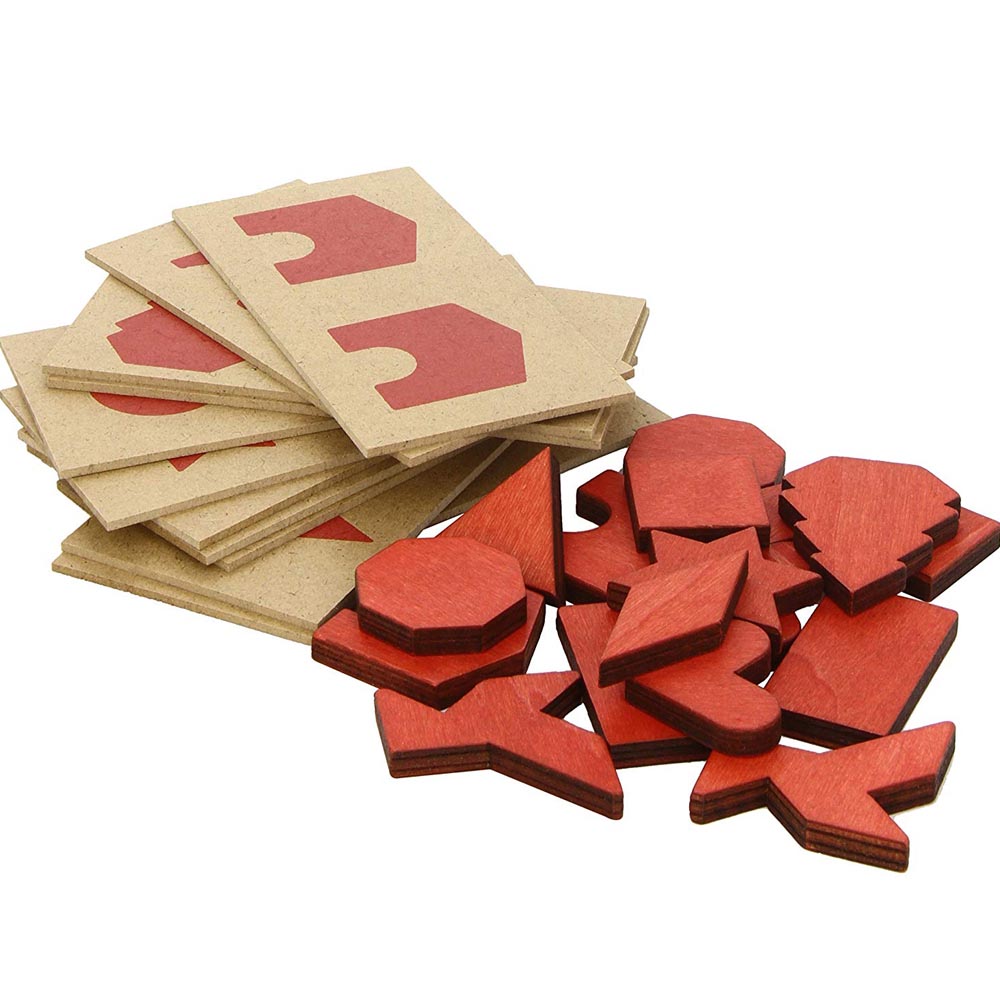 24 figuras de madera de 12 formas distintas y 12 tableros de madera. Juego de reconocimiento visual y táctil. Completa todos los tableros de figuras bidimensionales. Juego de atención y memoria. Asocia la silueta con su pieza. Reconoce las diferentes figuras. Dominio del espacio grafico y principios de perspectiva.