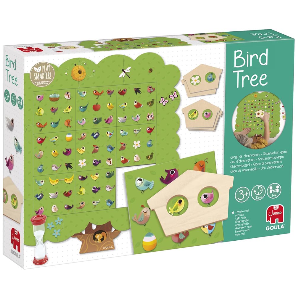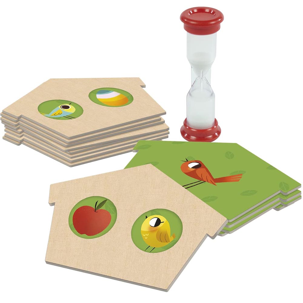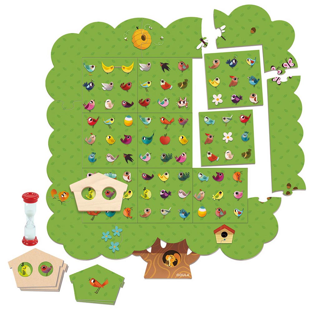 Juego preescolar educativo que consiste en encontrar en el árbol los elementos que se muestran en la carta antes de que se termine el tiempo. Existen 3 modalidades de juego: 1. Encontrar la Combinación: Con la casita de madera, se debe encontrar la combinación de pájaros que ha salido en la carta con fondo de color madera, 2. Encontrar las Parejas: Se debe encontrar la pareja del pájaro que ha salido en la carta con fondo verde y 3. Juego Libre: Se pueden combinar las dos modalidades anteriores en un único juego. Este juego promueve la observación y la agilidad visual, y ofrece infinitas combinaciones de juego.