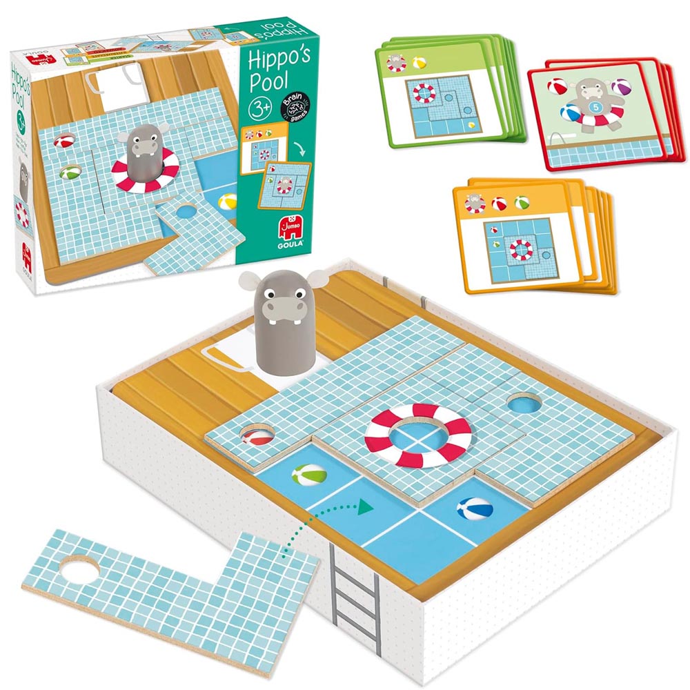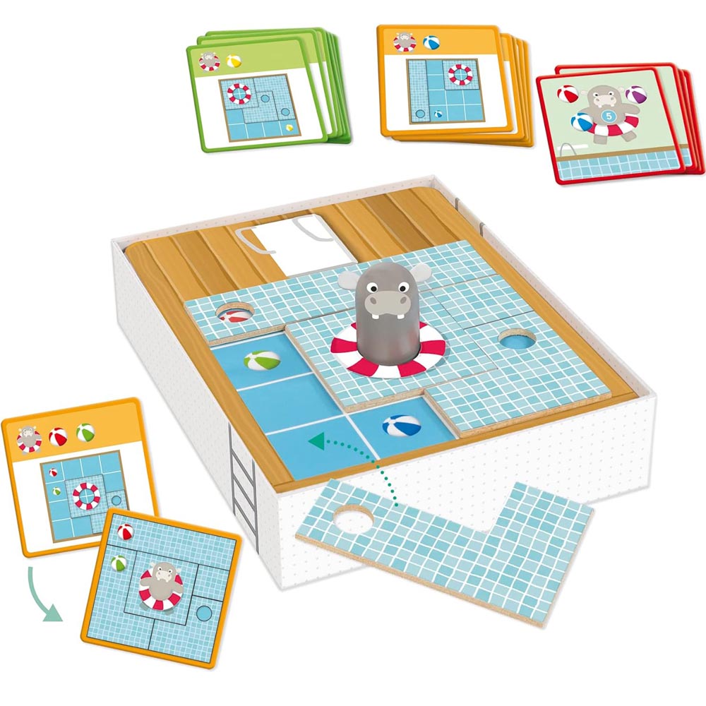 Juego preescolar educativo cuyo objetivo es construir correctamente con las piezas de madera los modelos de las cartas en función del flotador y las pelotas que tienen que ser visibles en la carta desafío escogida. La caja sirve como base del juego y hay que ir colocando las piezas según indica la tarjeta; estas tarjetas tienen un nivel progresivo en dificultad, tres en total. Juego auto correctivo ya que cada desafío tiene en su dorso la solución para que los pequeños puedan comprobarlo solos. Además se puede jugar individualmente resolviendo cada uno de los desafíos o con mas jugadores en el que los niños competirán entre ellos. Desarrollo del razonamiento lógico y la orientación espacial.