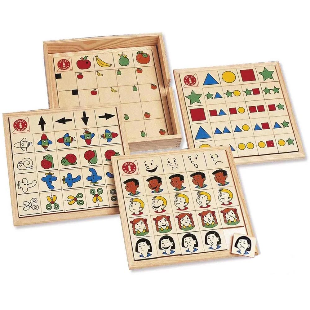 Juego de asociación lógica de distintos atributos y situación espacial. De excelente calidad y diseño. Contiene 4 tableros de madera de doble entrada (25 x 25 x 1 cm c/u) con ilustraciones sobre direccionalidad, cantidad, formas y expresiones, y 64 fichas ilustradas (4,5 x 4,5 x 0,5 cm) 16 fichas por cada tablero.