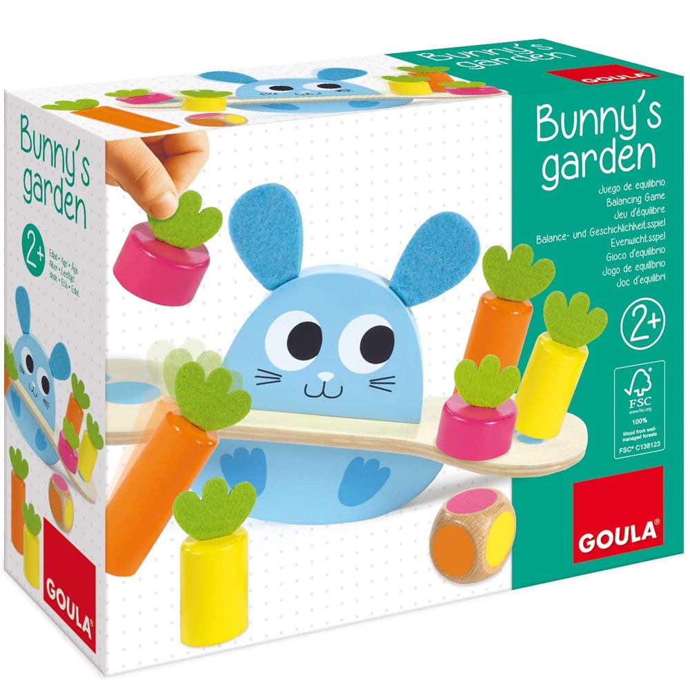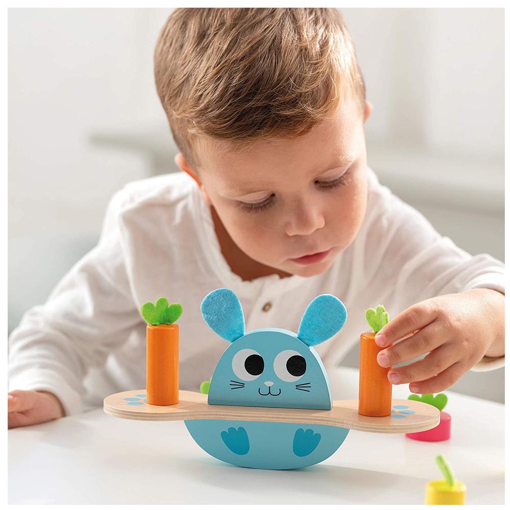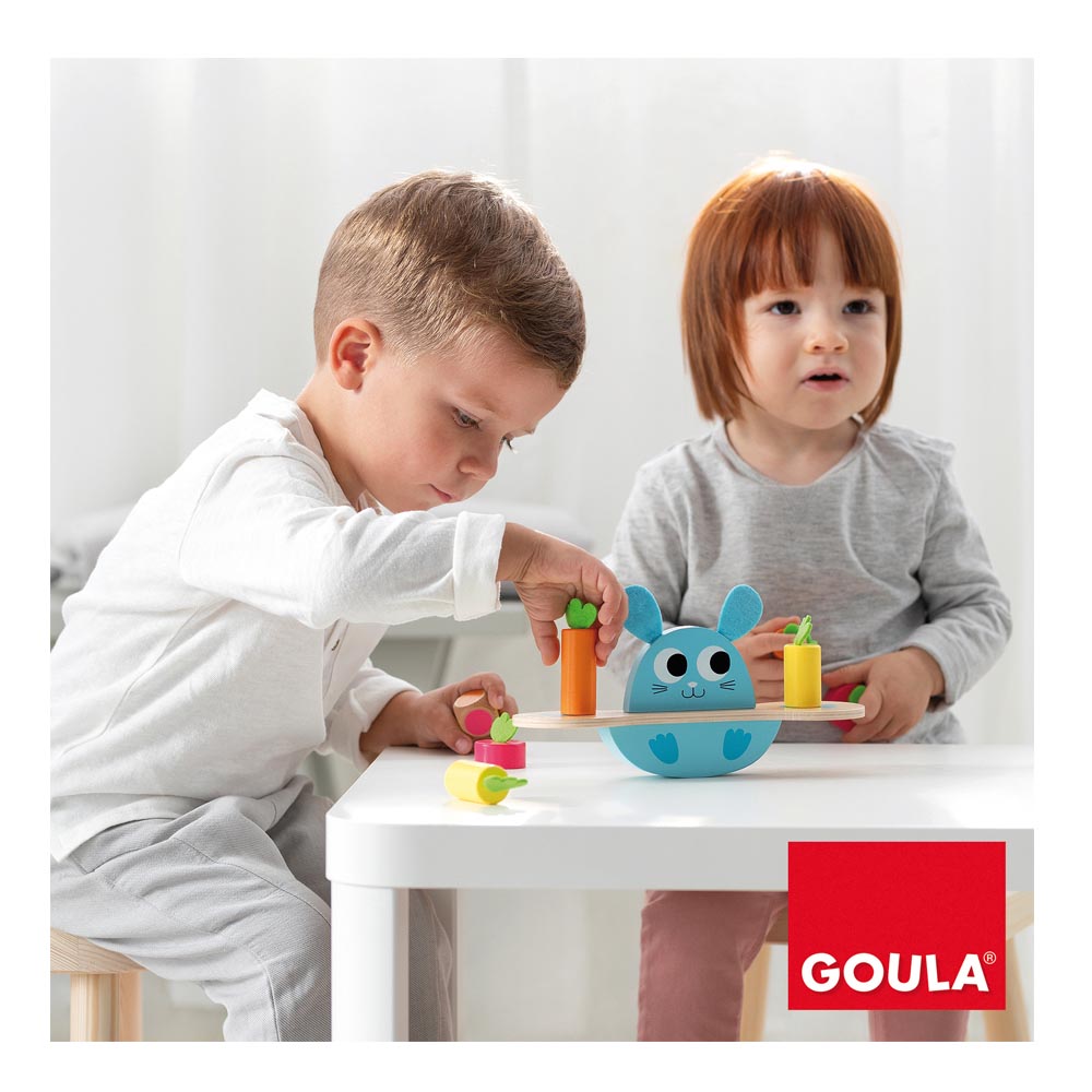 Divertido juego en el que se juega de forma cooperativa tratando de colocar todas las piezas sin que se caigan. Cuando todas las piezas están colocadas en el conejito, el juego termina. También se puede jugar en dos equipos repartiendo las piezas y tirando el dado, y el primer equipo en colocar todas las piezas gana. Este juego estimula el desarrollo de la habilidad mano-ojo, la precisión y el equilibrio. Incluye 1 conejito de madera que sirve como balanza, 6 orejas de fieltro, 6 hortalizas de madera y 1 dado de colores. Es recomendado para niños de 2 a 3 años.