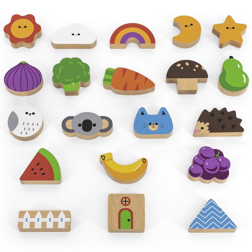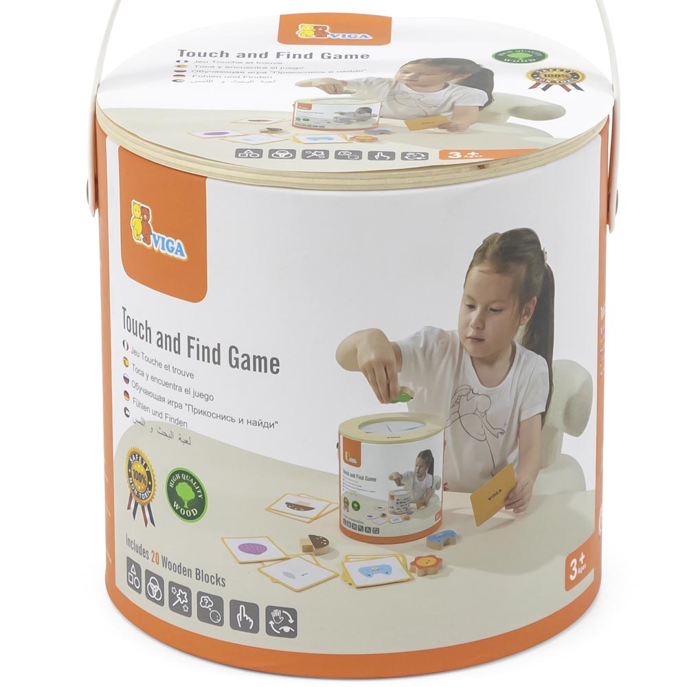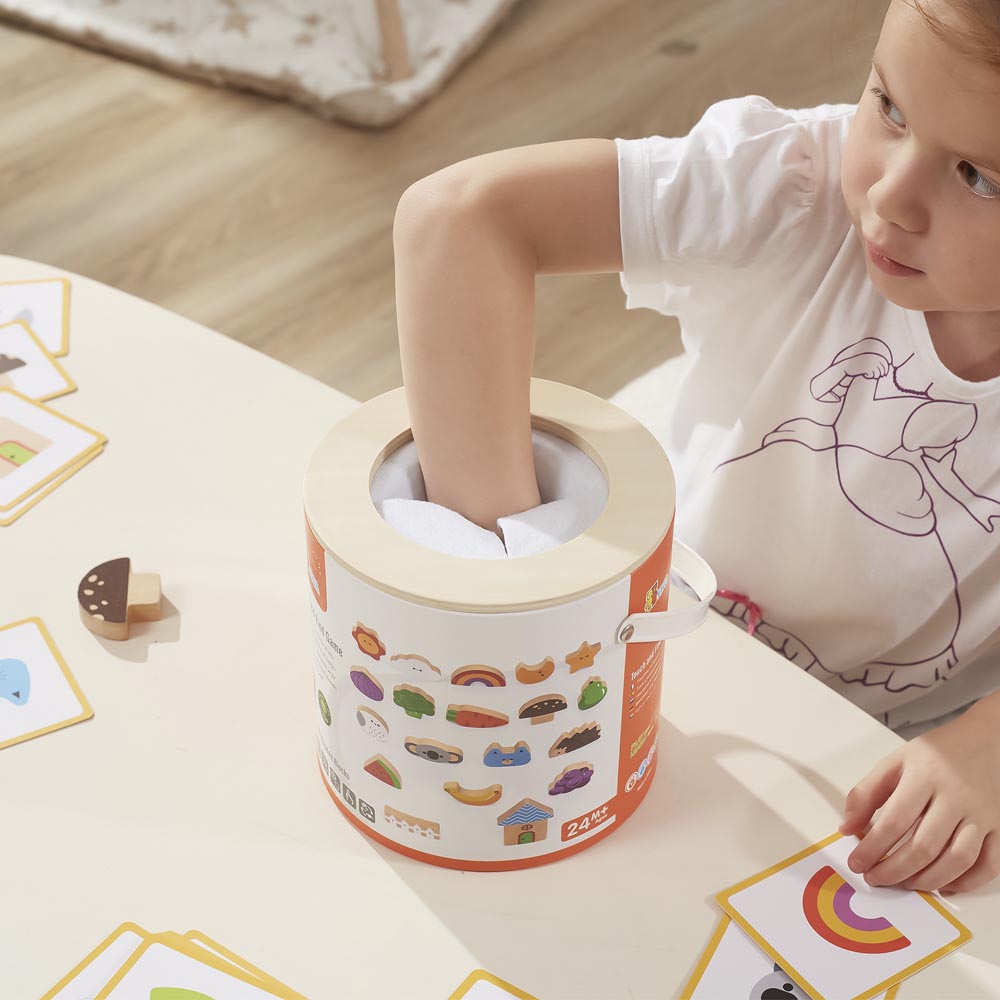Divertido juego de reconocimiento a través del sentido del tacto. Los niños y niñas deben sacar del tonel la pieza que corresponda según lo que indique la tarjeta que les haya tocado, la dificultad y originalidad de este juego es que deben encontrarla sin mirar, solamente a través del tacto. Fabricado en madera, de material suave y resistente y colores vivos. Contiene 20 piezas gruesas que se pueden usar para jugar también libremente y 20 tarjetas.