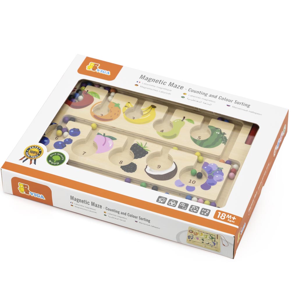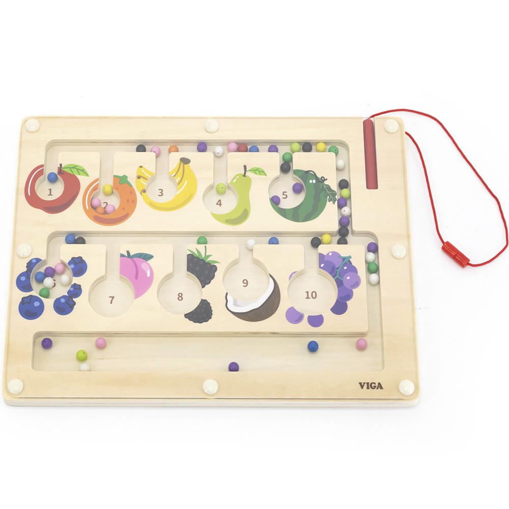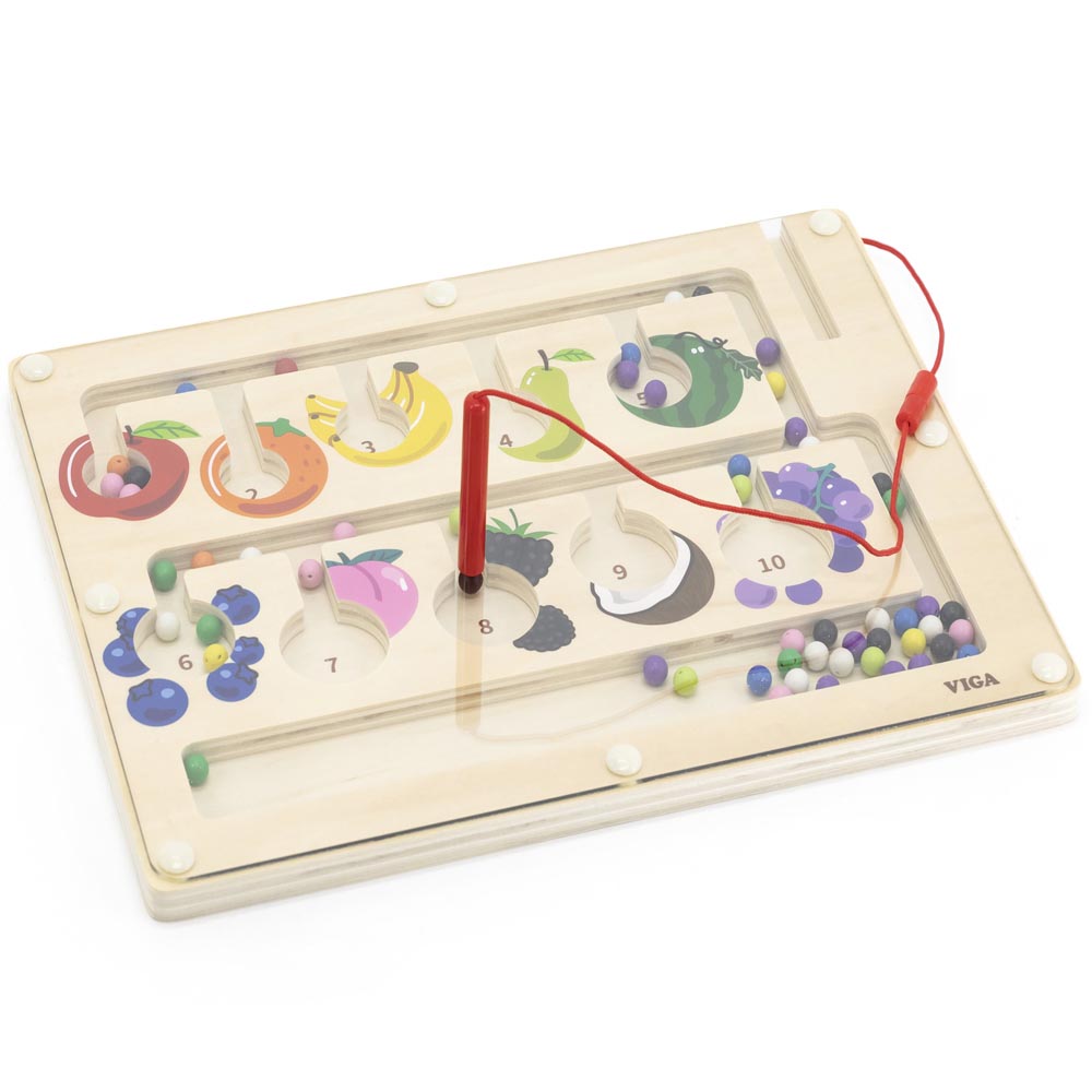 Divertido juego educativo para pasar horas de diversión. Con este juego los niños y niñas aprenderán los números asociados a las cantidades que representan y los nombres de las frutas de una forma muy entretenida. Con el lápiz magnético los jugadores deben ir llevando las bolitas según los colores y las cantidades indicadas. Fabricado en madera. De material suave y resistente y colores vivos.
