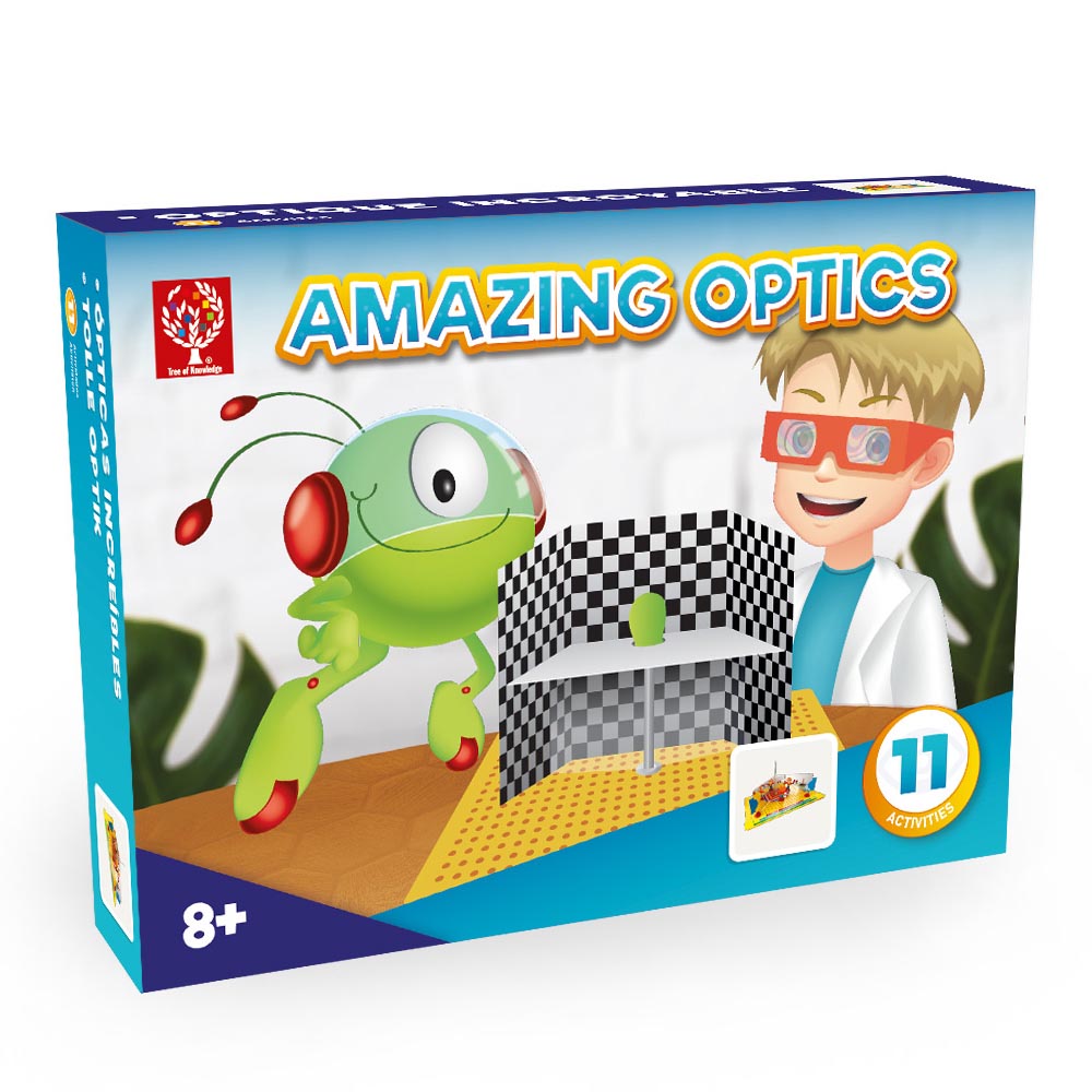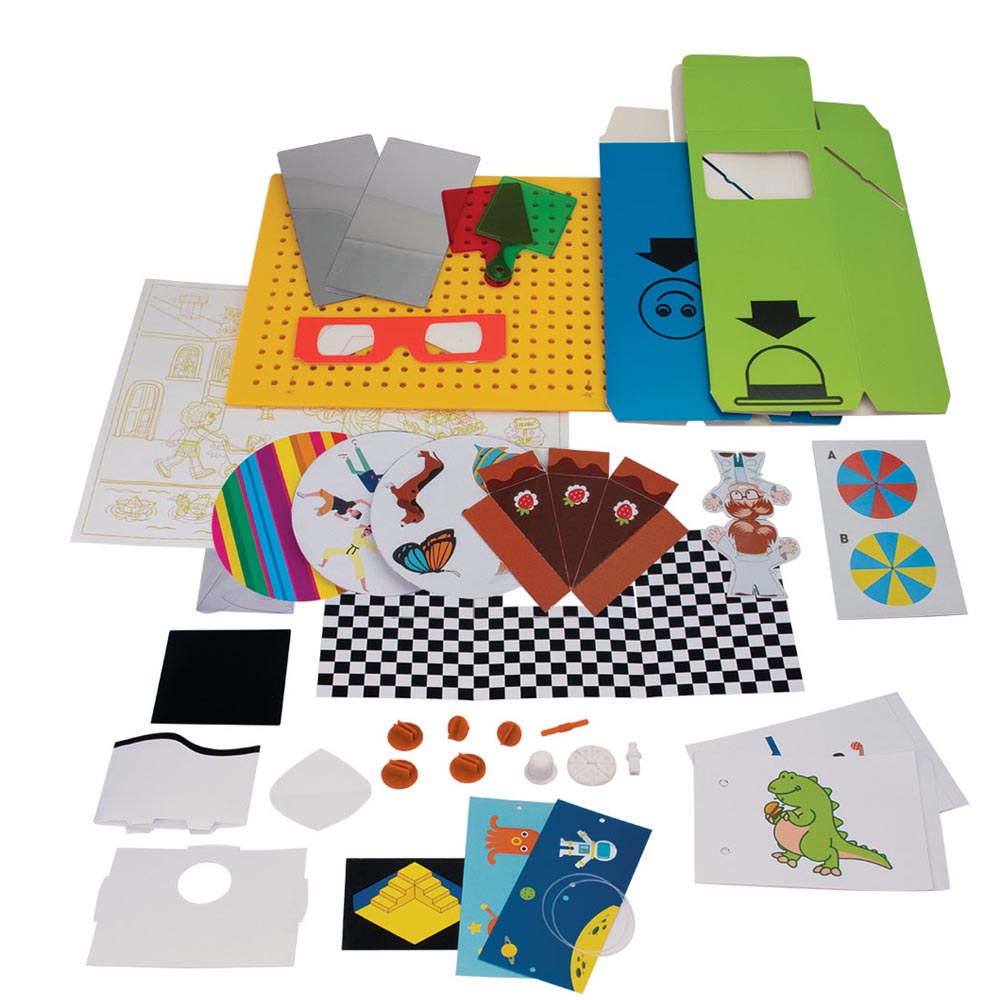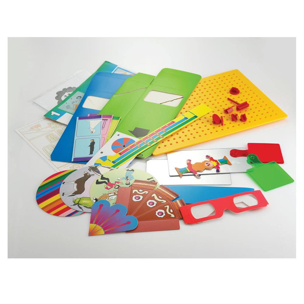 Equipo de ciencia para niños pequeños. Instrucciones graficas que muestran como trabajar con los conceptos básicos en el campo de la óptica. Jugar con espejos, construir un periscopio, experimentar con ilusión óptica, y muchos experimentos mas.