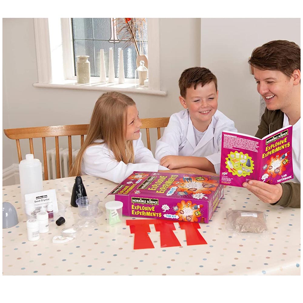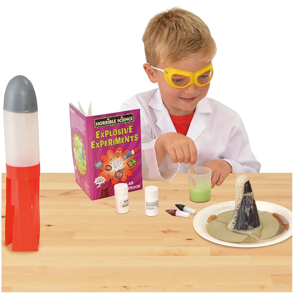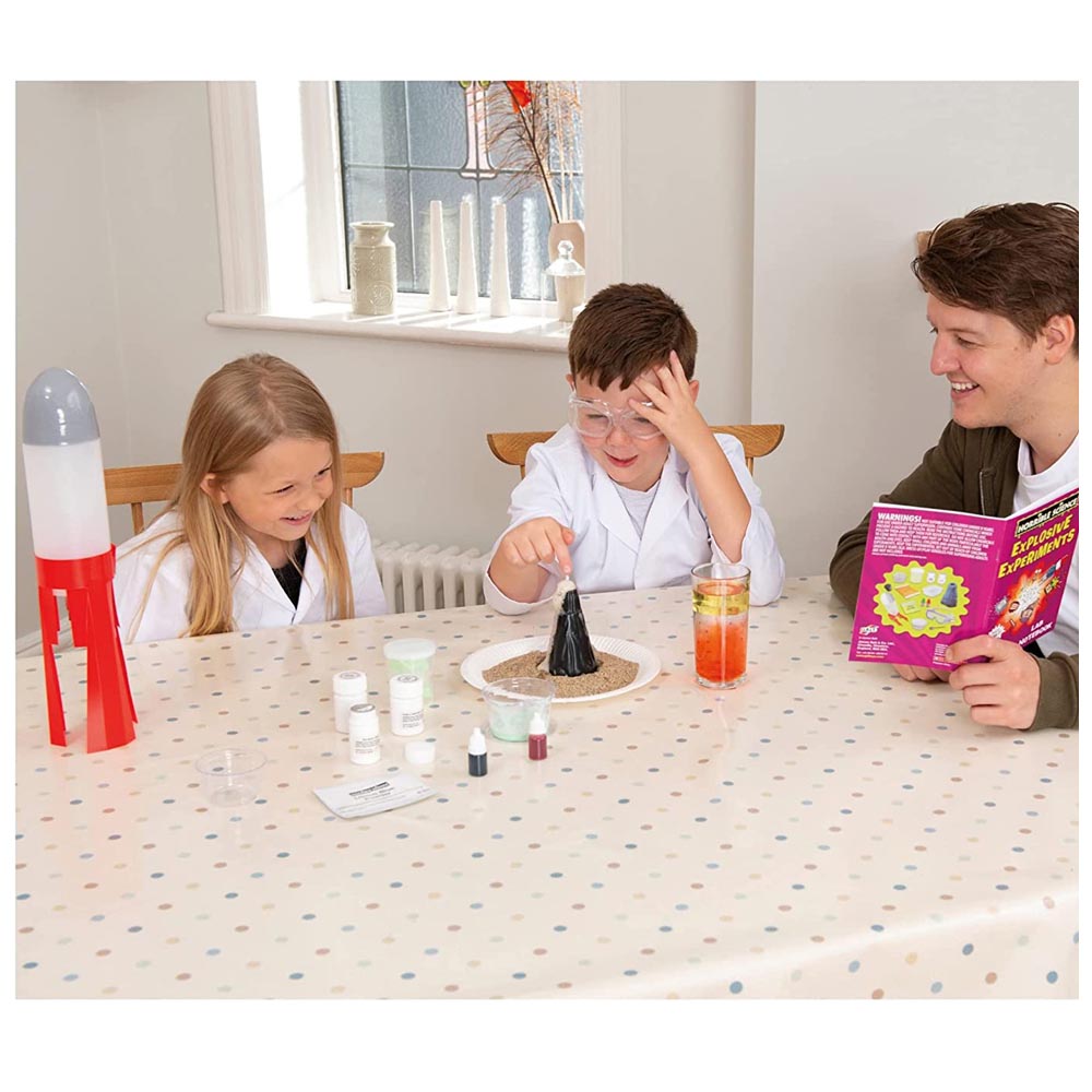 ¡Con este divertido set de experimentos pasaran cosas extremadamente explosivas! Crea y lanza un cohete genial, observa la erupción de un volcán, haz una lámpara de lava y mezcla mocos muy viscosos. Contenido: Cohete de plástico, cono de nariz, aletas, volcán de plástico, arena, gafas protectoras, carbonato ácido de sodio, polvo de baba, pegamento, colorante alimentario verde y rojo, recipiente con tapa, tapón de goma, válvula, 2 recipientes para mezclar, top secret de 32 páginas cuaderno de laboratorio. Un divertido juego para acercar a los más pequeños a las ciencias y la experimentación.