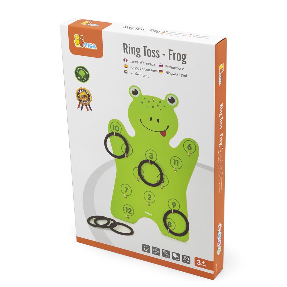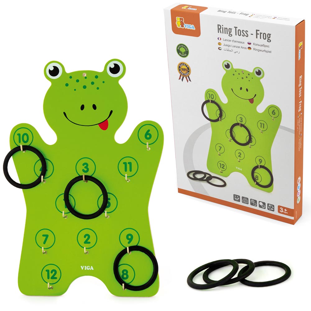 Juego de lanzar que consiste en un panel de madera con forma de sapo con ganchos para afirmar los anillos y con diferentes números y 6 anillos para lanzar. El sapo se puede colgar en la pared o bien apoyar en el piso. Juego seguro y entretenido para toda la familia.