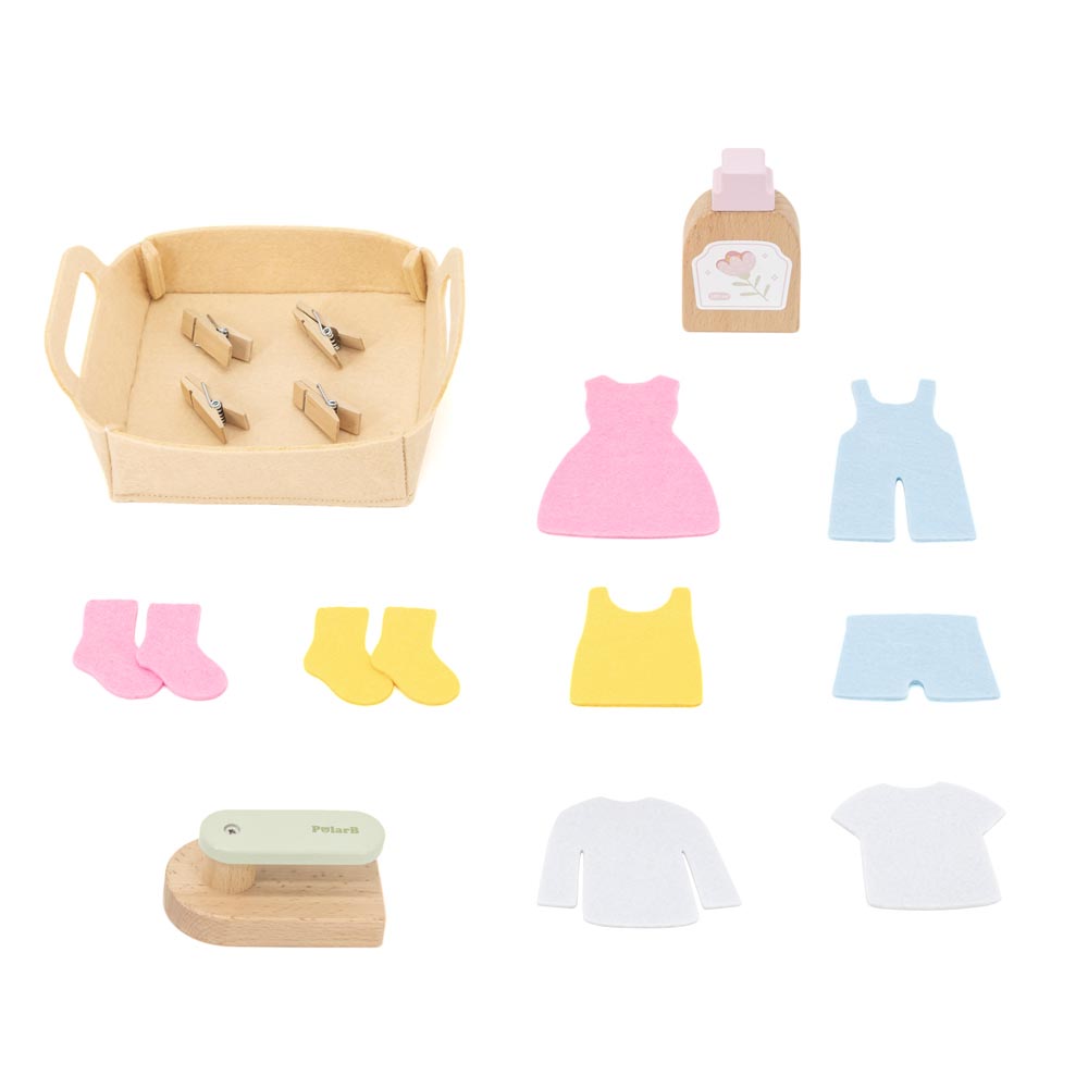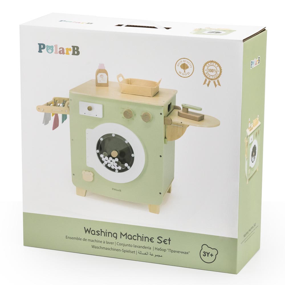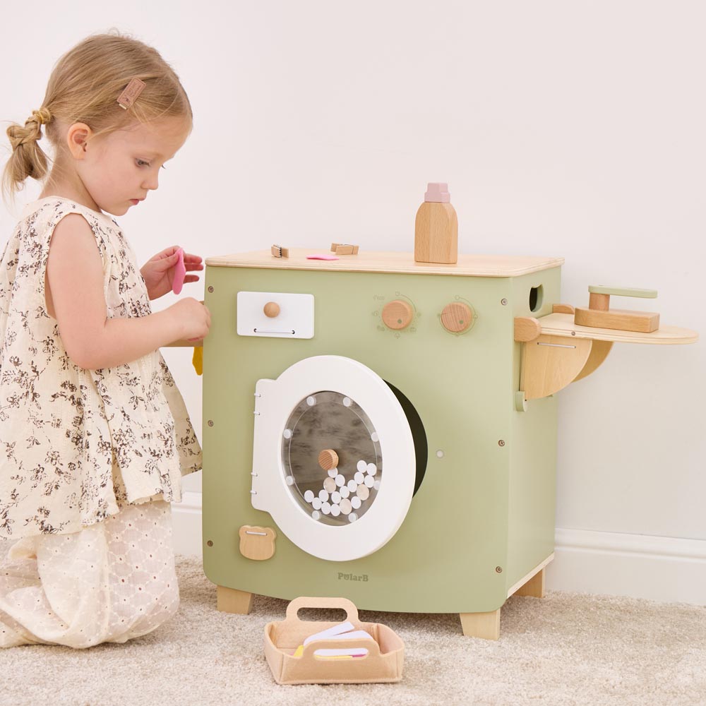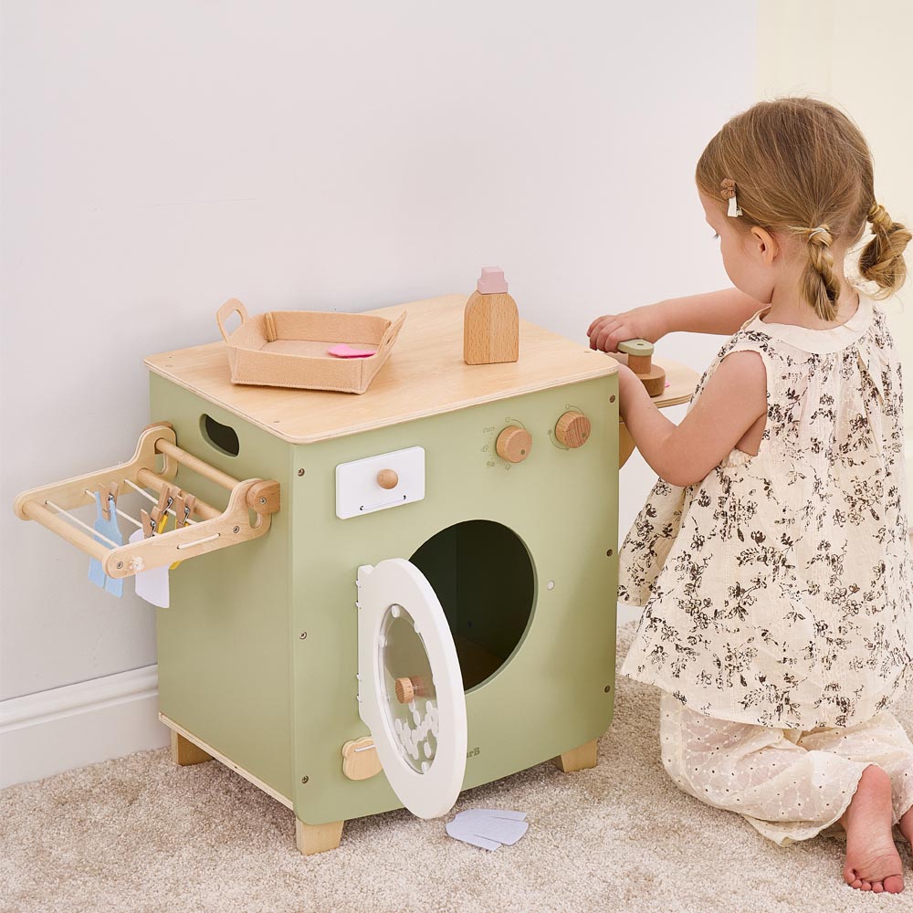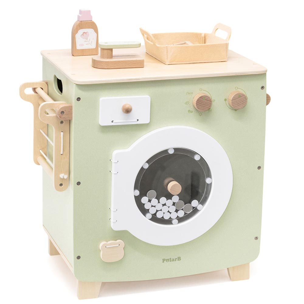 Hermosa lavadora de madera para pasar horas de diversión. Este juego de lavadora ofrece una experiencia completa de lavado para los más pequeños: lavado, secado y planchado. Su puerta giratoria simula el movimiento de burbujeo. Una vez finalizado el ciclo de lavado los niños y niñas pueden usar las pinzas para colgar la ropa y luego plancharla en la mesa auxiliar. Incluye una botella de detergente, un cesto para la ropa, una plancha, algunas prendas de tela y varias pinzas. Un juego diseñado para fomentar el juego creativo e imaginativo. Fabricado en madera, con colores suaves y material duradero y resistente.