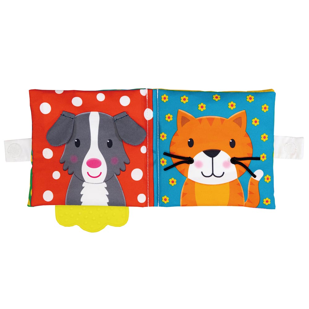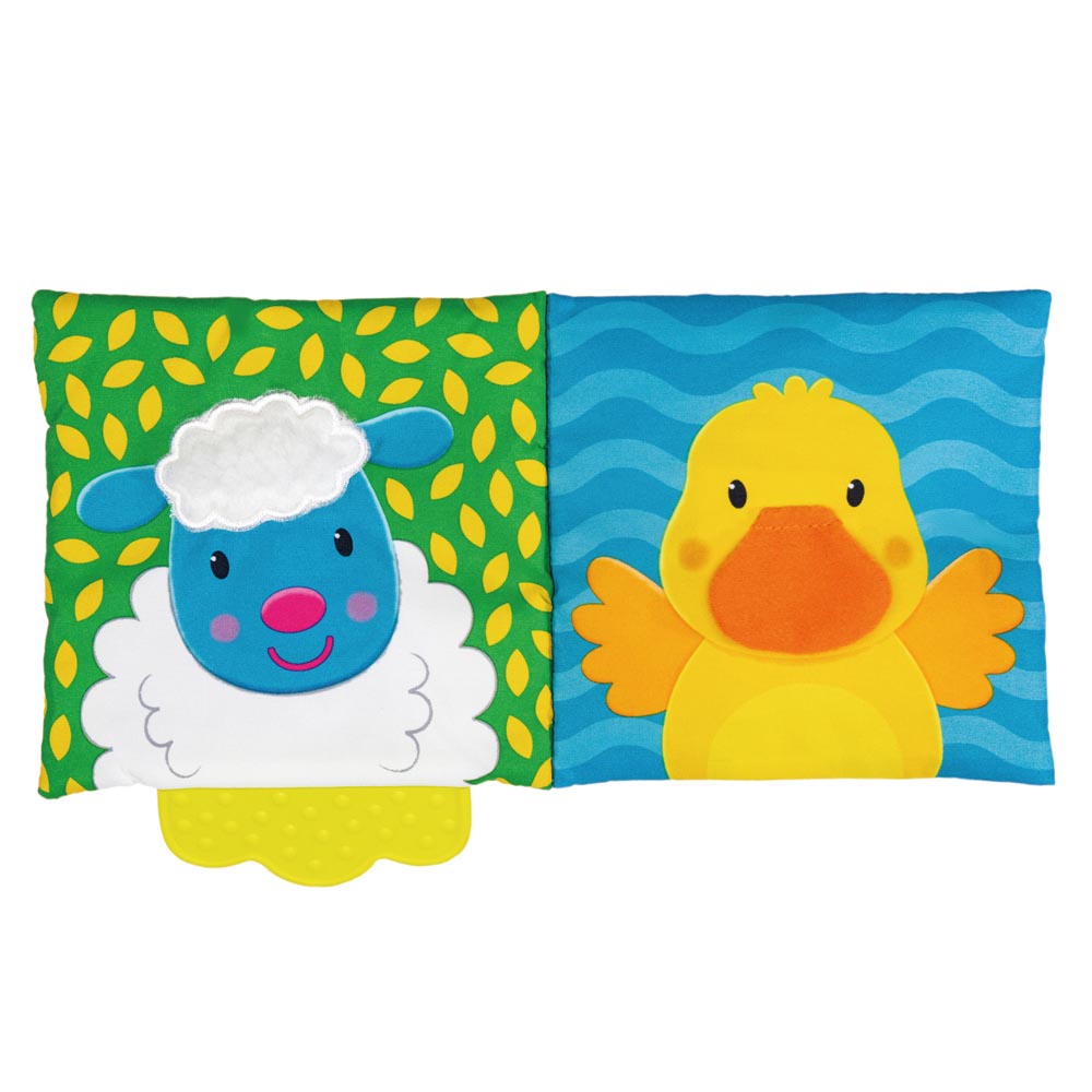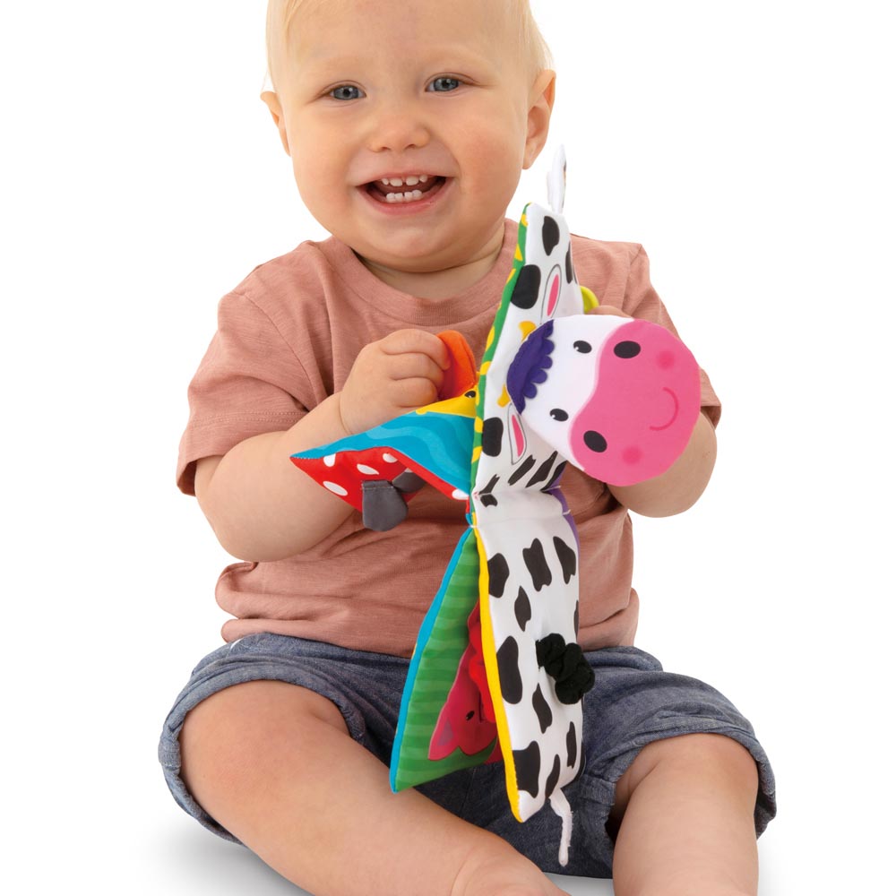 En la tapa de este divertido libro está la cabeza de la vaca y su cola en la parte de atrás. Las páginas con acolchado suave contienen material arrugado que los bebés encontrarán muy atractivo y estimulante. Dentro podrán ver lindos animales; oveja, pato, perro, gato, chancho, gallina. Todos ellos con variadas texturas para que los bebés toquen e investiguen. Además tiene un enlace súper práctico para sujetarlo al coche, la cuna o el asiento del automóvil.