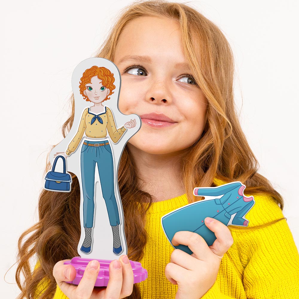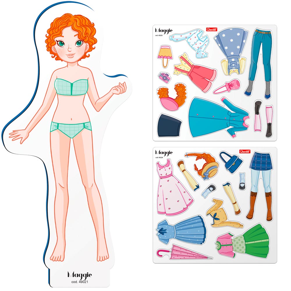 Nuevos looks y muchos nuevos vestidos magnéticos que combinar para crear el outfit perfecto. Juega con Maggie, la muñeca recortable Maggie para crear innumerables historias nuevas y liberar tu imaginación. Los atuendos se pueden dividir para experimentar con aún más combinaciones gracias a las 29 piezas magnéticas del paquete. ¡Juega con Anna y Laura para mezclar todos los estilos!