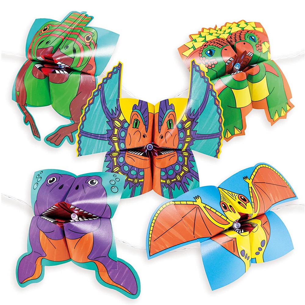 Con este divertido set podrás hacer guirnaldas con luces de dinosaurios. Las figuras de origami ayudan a desarrollar la motricidad fina de una forma muy divertida. Contiene: 10 hojas de dinosaurios, 2 hojas de partes del cuerpo de los dinosaurios, 10 luces led con pack de baterías, 2 x AA baterías, 10 clips, 6 plumones, una hoja de stickers, círculos para pegar y guía.