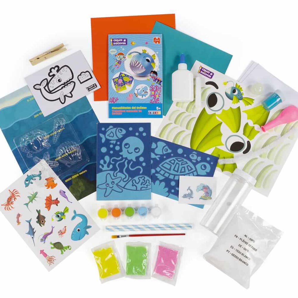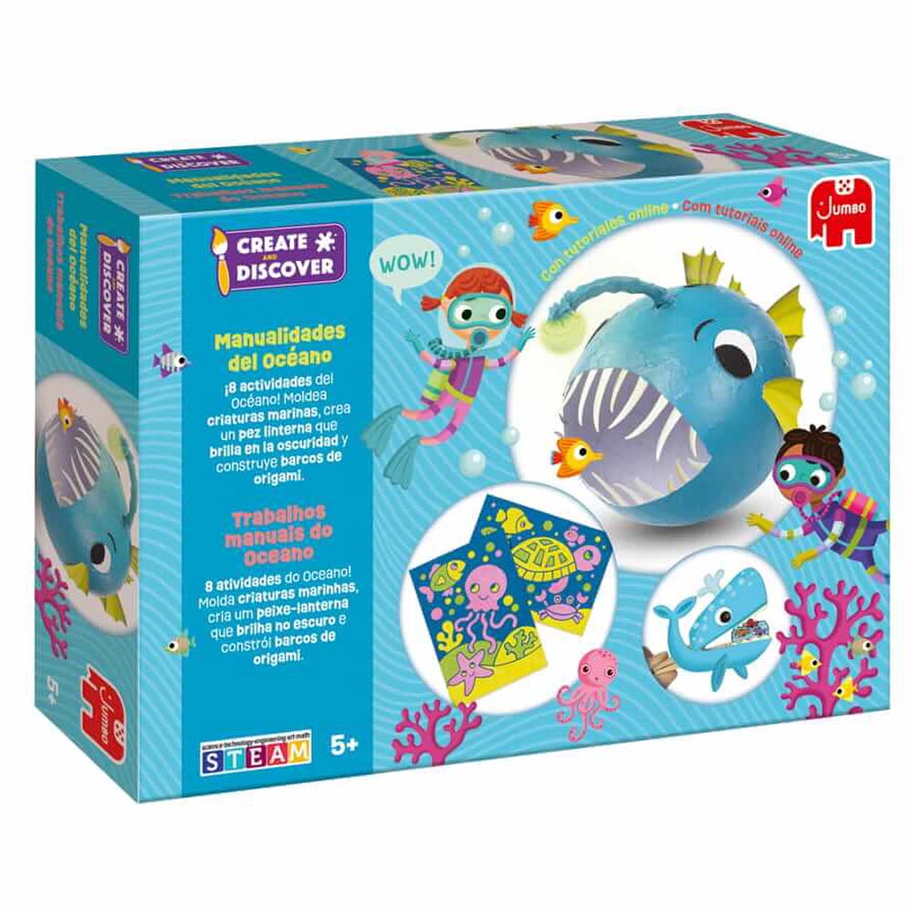Divertido kit de manualidades sobre el océano diseñado para fomentar la creatividad de los más pequeños mientras adquieren conocimientos del océano a través de vídeos interactivos. Contiene 8 actividades para realizar las manualidades y una guía práctica. Recomendado a partir de los 5 años.