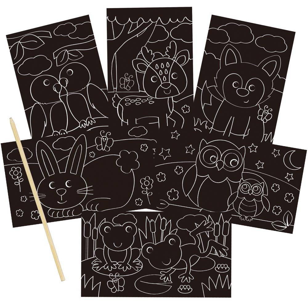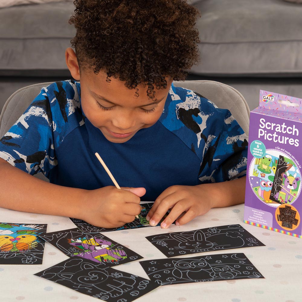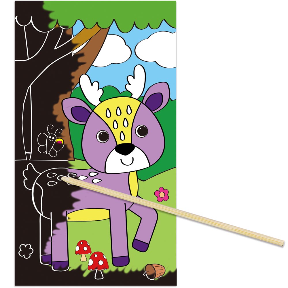 Divertido set de cartas con ilustraciones muy divertidas que a los niños y niñas les encantarán. Solo deben raspar las imágenes en negro con el palito de madera incluido en el set y así descubrirán hermosas ilustraciones. Un juego de manualidades que estimula el agarre del lápiz, la motricidad fina, la concentración y otras habilidades cognitivas de una forma muy entretenida. Para pasar horas de diversión.