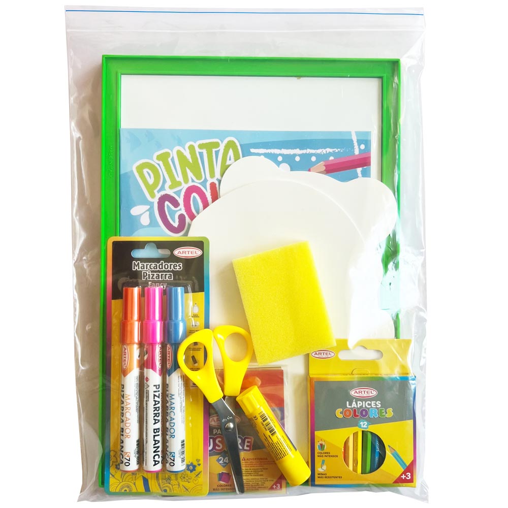 Set de manualidades que contiene una pizarra de plástico imantada con borde plástico de color, 1 borrador de espuma, pegamento en barra, papel lustre (set 12 colores), 3 plumones de colores para pizarra, 2 block con formas (surtidas) para pintar, 1 set de 12 lápices de colores, 1 tijera y 1 libro para pintar.