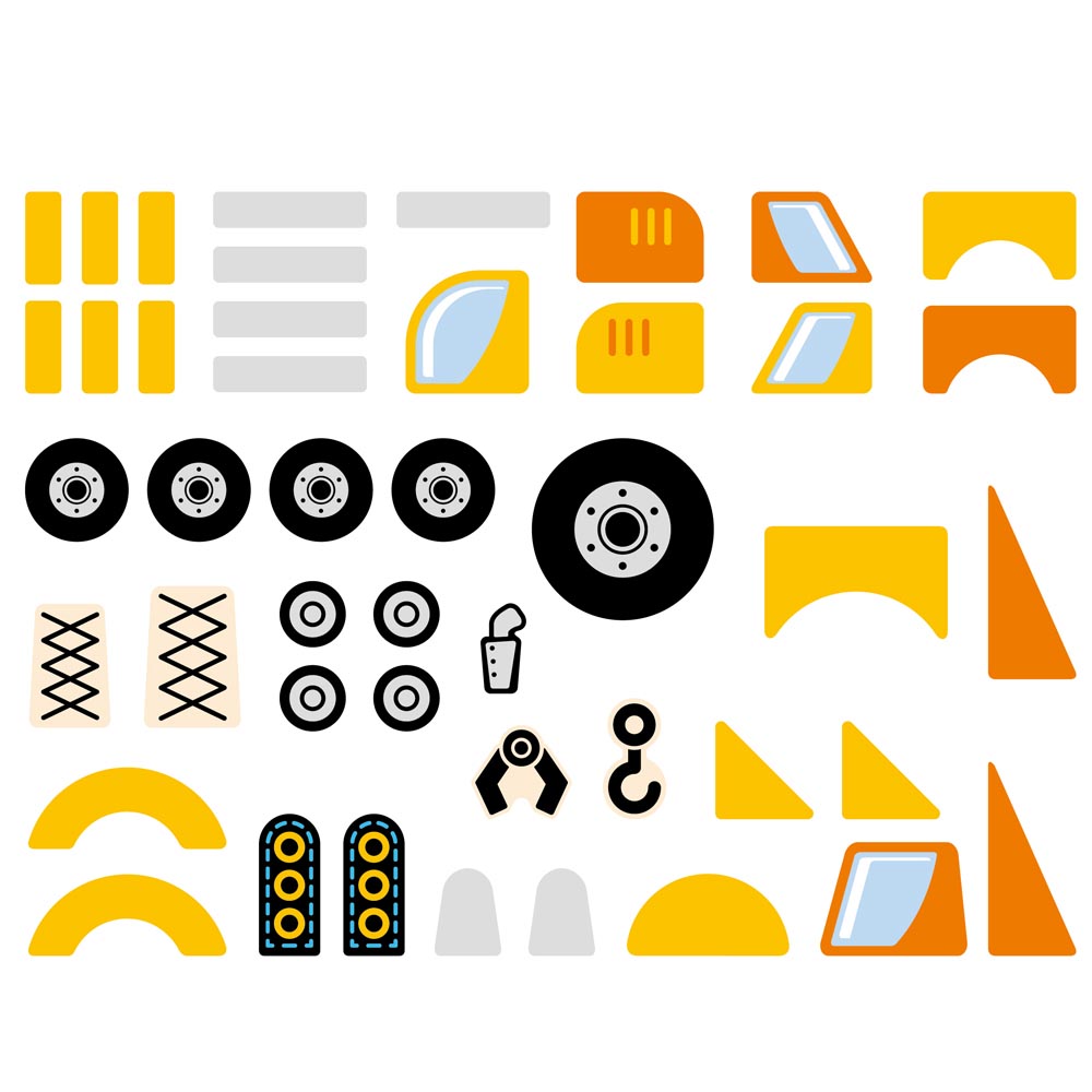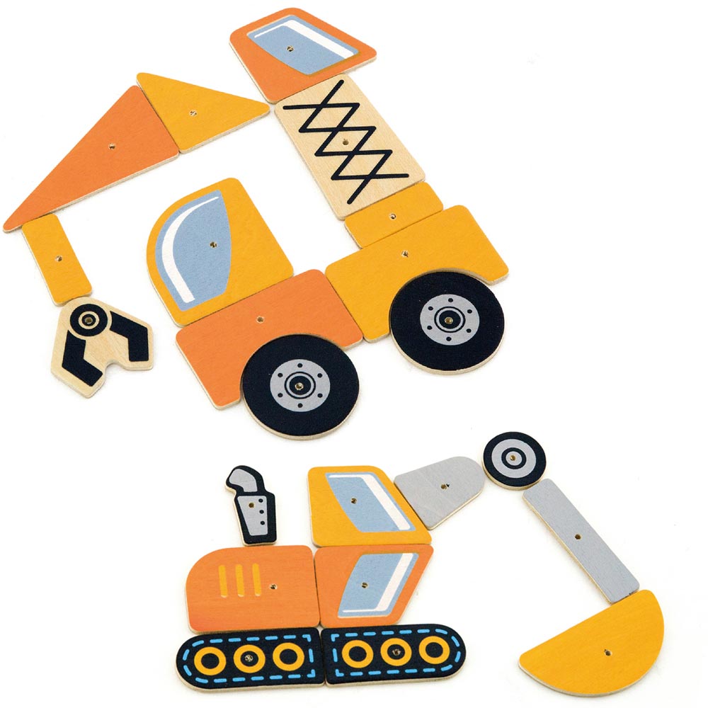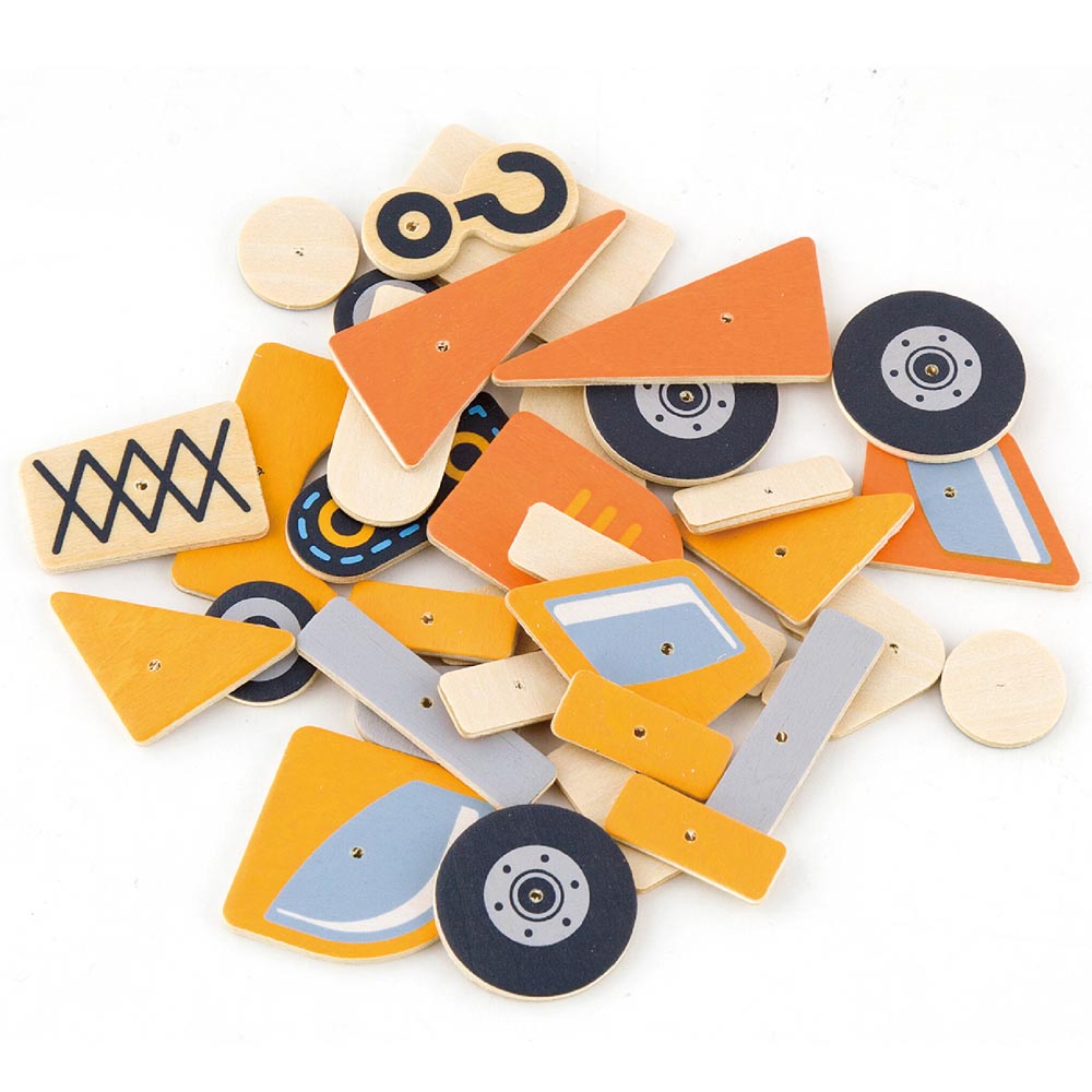 Juego de martillar que contiene 45 piezas de madera, 1 tablero de corcho, 1 martillo, 5 cartas de 10 imágenes de ejemplos y una caja de tachuelas. Los niños se pueden guiar por las cartas o utilizar su imaginación creando diferentes vehículos de construcción.