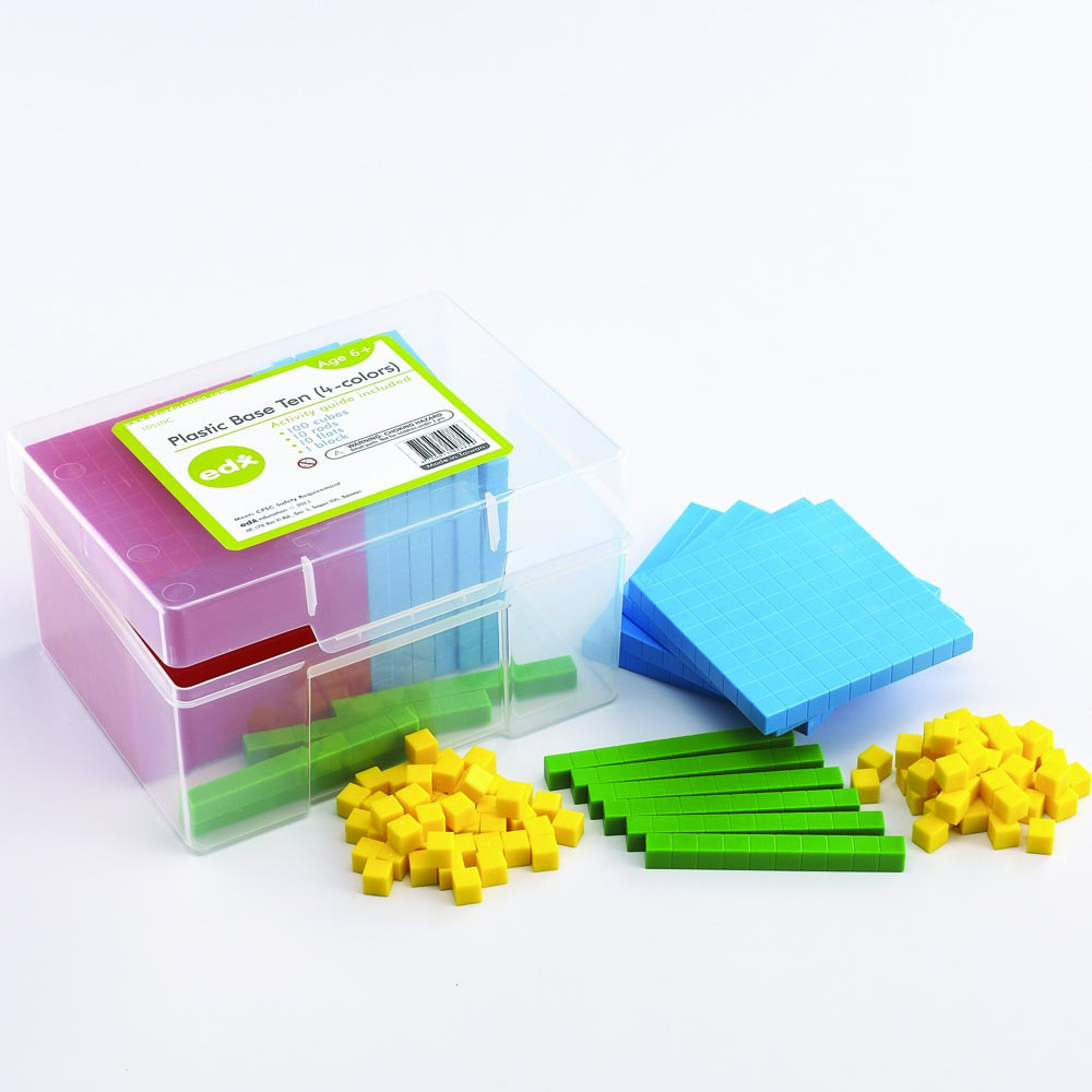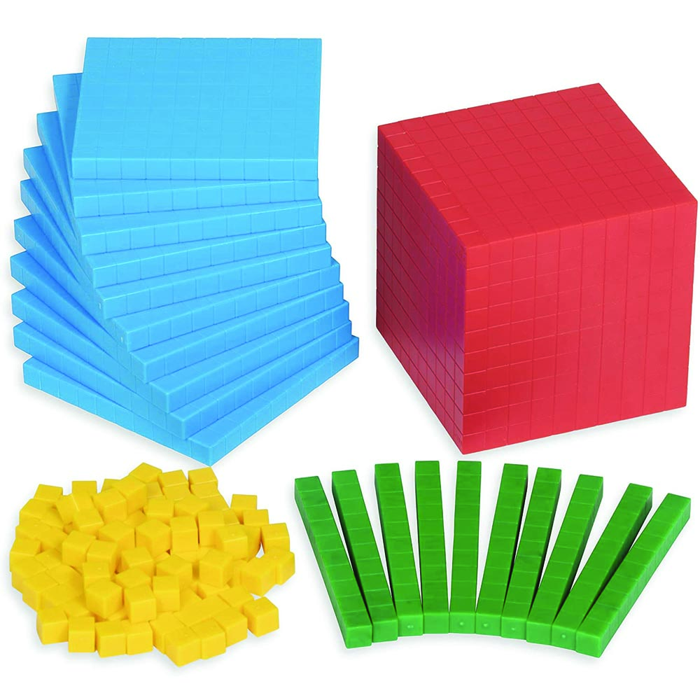 Material fundamental para cuando se estudia en matemáticas el valor del lugar. Contiene 1 cubo rojo, 10 pisos azules, 10 barras verdes y 100 cubos amarillos. De gran calidad y resistencia.