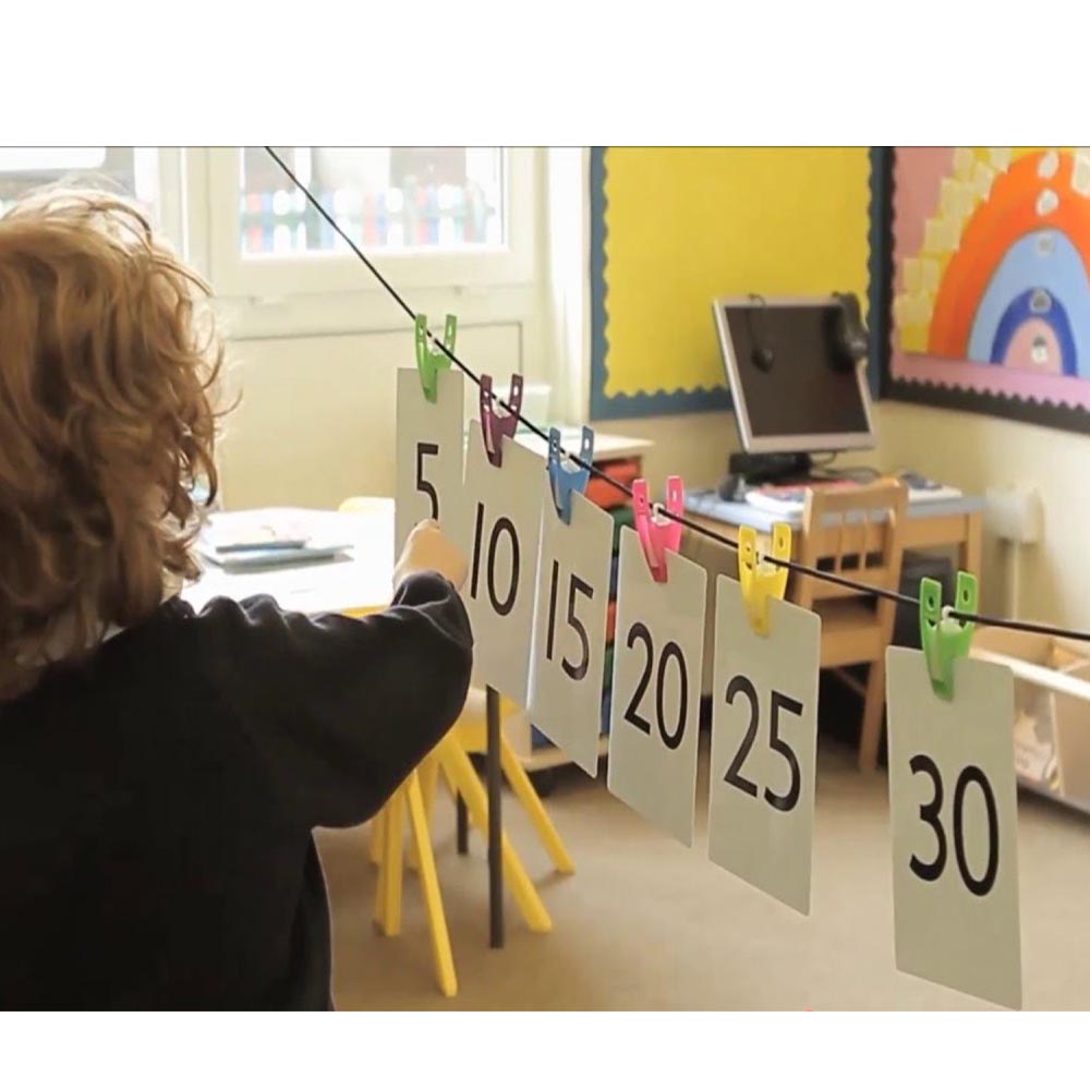 Ofrece a los niños una imagen visual para entender la suma y la resta, secuencias de conteo hacia atrás y hacia delante. 32 tarjetas de números, 10 tarjetas limpias para escribir el numero, 15 sujetadores. Contenedor para almacenar.