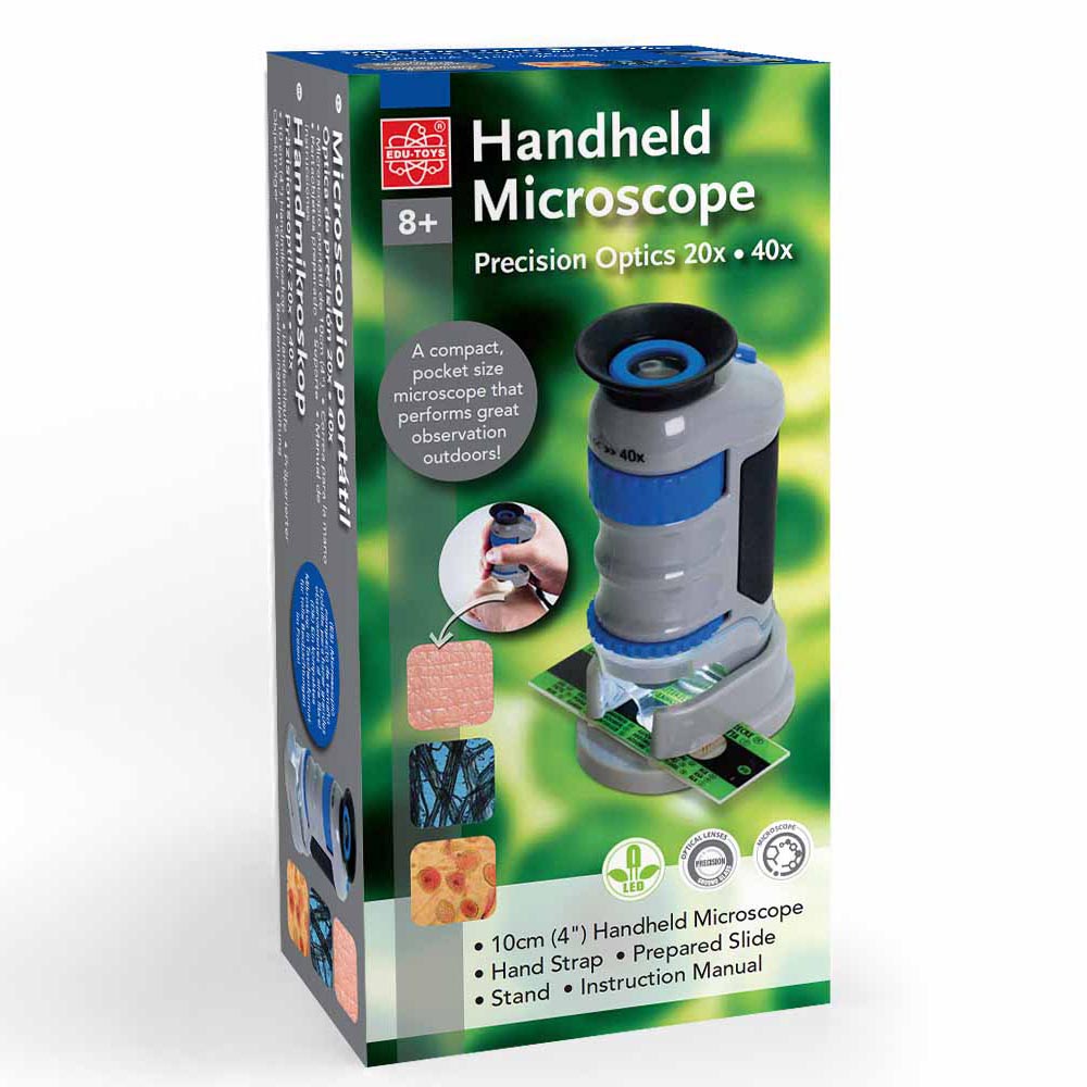 Un microscopio compacto de bolsillo que realiza excelentes observaciones al aire libre. Incluye: microscopio portátil de 10 cm (4”), correa, portaobjetos preparado y soporte. Utiliza 1 pila AAA (No incluida)