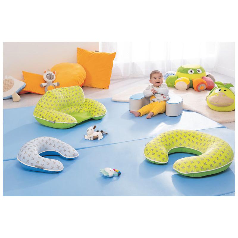 Modulo apoya espalda que ayuda a l@s niñ@s a encontrar el equilibrio cuando empieza a sentarse. Los bebes se sienten seguros cuando están rodeados por el cojín. Este cojín se apoya de forma segura. Revestido en vinyl muy resistente, de fácil mantenimiento. Espuma de 24 kg/m³: fijación y longevidad. Cosidos y sin cremalleras para no lastimar a los niños, estas costuras estilo «tapicero» las hacen herméticas y evitan que los niños accedan al interior. De fácil lavado con un paño suave en agua jabonosa fría. Color azul/beige. (Stock limitado, preguntar por si necesita mas de una unidad)