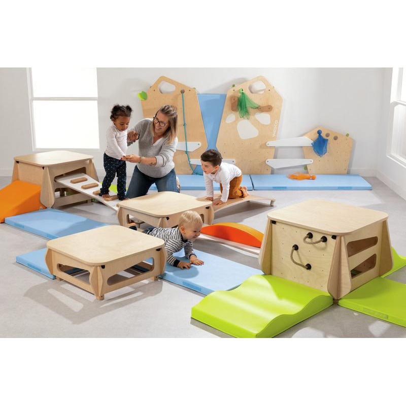 Divertido juego diseñado para escalar desde pequeño. CLIMB Up es la primera gama diseñada para proporcionar una zona de escalada segura desde los primeros años. Bajo la supervisión de un adulto y mientras se divierten, los más pequeños se apoyan en las presas de corcho para escalar a su propio ritmo. Desarrollan así sus habilidades físicas, su curiosidad y su confianza en sí mismos. El set incluye 1 módulo mediano, 1 cobertor, 1 tabla de trepar, 1 módulo BABI de pendiente pequeña y 1 módulo BABI de onda suave. Dimensiones de los componentes del kit: Módulo mediano: Ancho: 68,5 cm – Alto: 44 cm. Tapa: Ancho: 60 cm – Alto: 7,9 cm. Tabla de escalada: Largo: 116 cm – Ancho: 29 cm – Altura: 6,5 cm. Módulos BABI pequeña pendiente: lateral: 48 cm – Altura: 12 cm. Módulos BABIsoft wave: lateral: 48 cm – Altura: 24 cm.