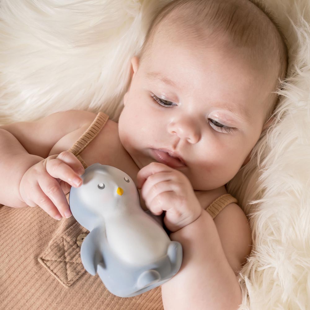 Mordedor de caucho 100% natural diseñado para un fácil agarre con las manos pequeñas. El cuerpo de este hermoso animal es excelente como mordedor para ayudar a calmar las encías irritadas. Pintado con tintas a base de soja y listo para viajar a la boca, a la tina y mas allá. Material no tóxico, fabricado en caucho orgánico natural puro. Todos los productos de esta maravillosa marca son fabricados de forma sostenible y con materiales biodegradables, fabricación socialmente responsable, hecho a mano. Presentación en caja.