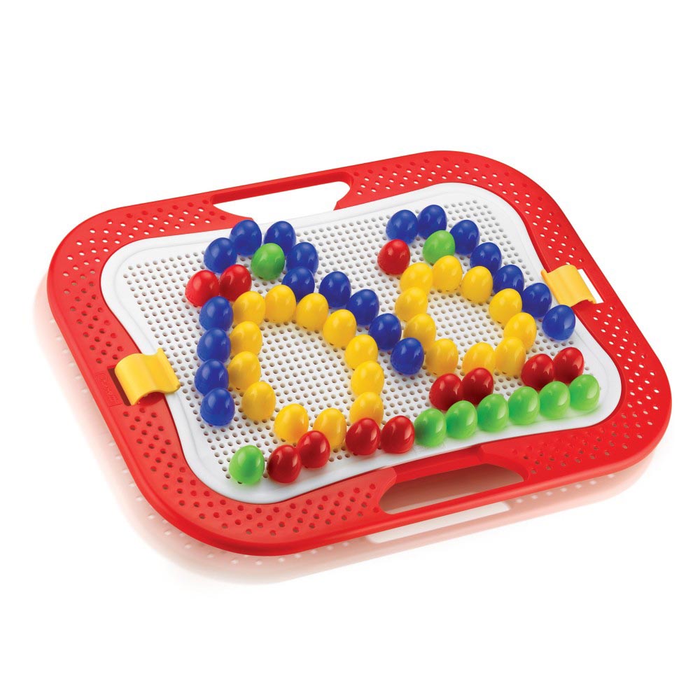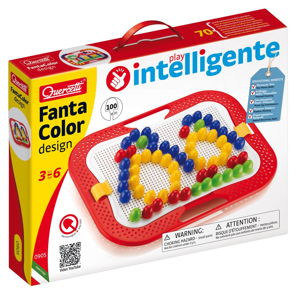 La línea Fantacolor Design consta de un marco perforado con bordes redondeados. Se puede disponer en horizontal o en vertical, gracias al pie en los bordes. Incluye 1 soporte de caballete, 1 tablero de clavijas, 1 álbum con patrones de diseño, 300 clavijas en 3 tamaños diferentes (10, 15, 20 mm).