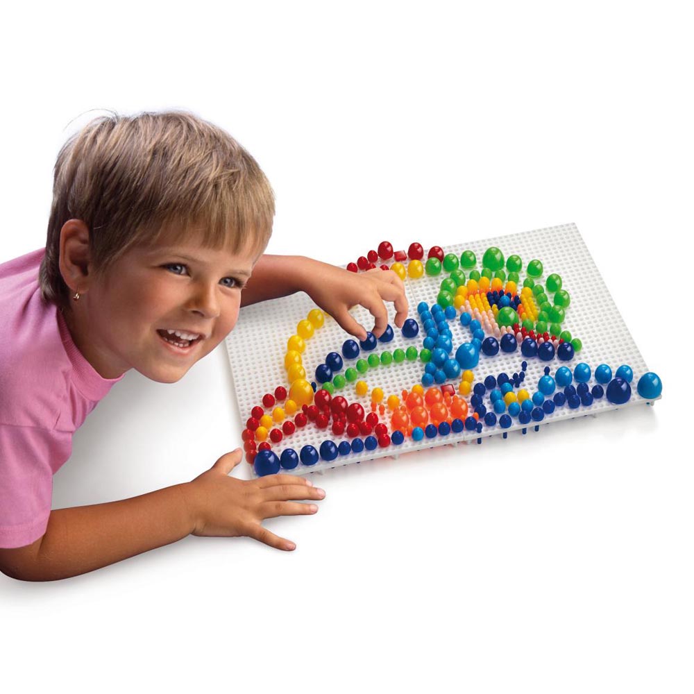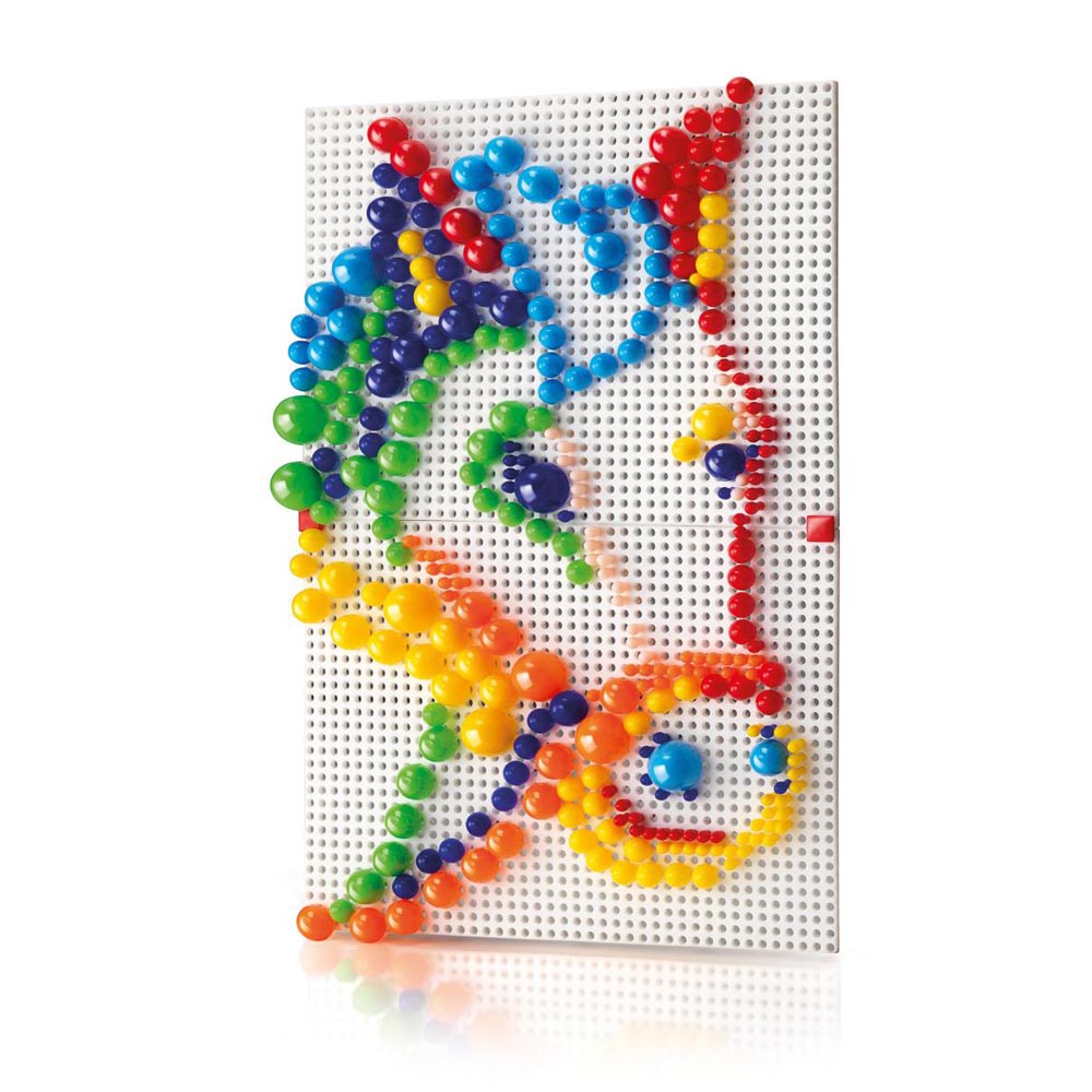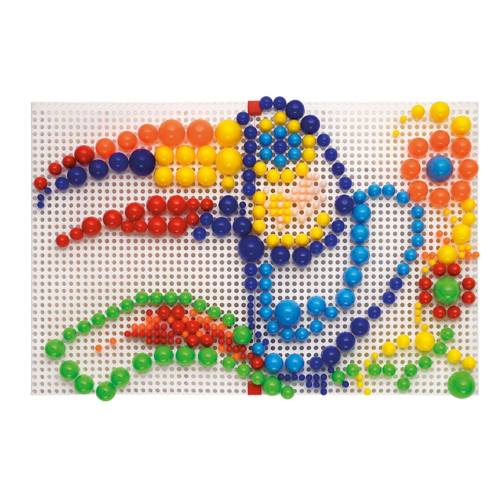 Este mosaico modular hará que la creación de mosaicos grandes y hermosos sea muy divertida. Comience por unir los tableros de clavijas, ya sea vertical u horizontalmente, y asegúrelos con los conectores rojos. Luego elija los colores que más le gusten y comience a componer una imagen inventando sus propios diseños o siguiendo una de las fotos del modelo del folleto que viene con el juego. Insertar clavijas en el tablero para formar mosaicos es una actividad divertida, creativa y educativa que fomenta la expresión artística, afina las habilidades manuales y desarrolla la coordinación mano-ojo.